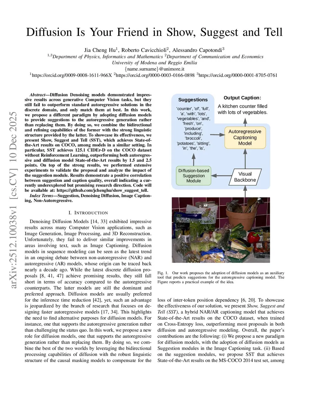 Diffusion Denoising models demonstrated impressive results across generative Computer Vision tasks, but they still fail to outperform standard autoregressive solutions in the discrete domain, and only match them at best. In this work, we propose a different paradigm by adopting diffusion models to provide suggestions to the autoregressive generation rather than replacing them. By doing so, we combine the bidirectional and refining capabilities of the former with the strong linguistic structure provided by the latter. To showcase its effectiveness, we present Show, Suggest and Tell (SST), which achieves State-of-the-Art results on COCO, among models in a similar setting. In particular, SST achieves 125.1 CIDEr-D on the COCO dataset without Reinforcement Learning, outperforming both autoregressive and diffusion model State-of-the-Art results by 1.5 and 2.5 points. On top of the strong results, we performed extensive experiments to validate the proposal and analyze the impact of the suggestion module. Results demonstrate a positive correlation between suggestion and caption quality, overall indicating a currently underexplored but promising research direction. Code will be available at:this https URL\_suggest\_tell.