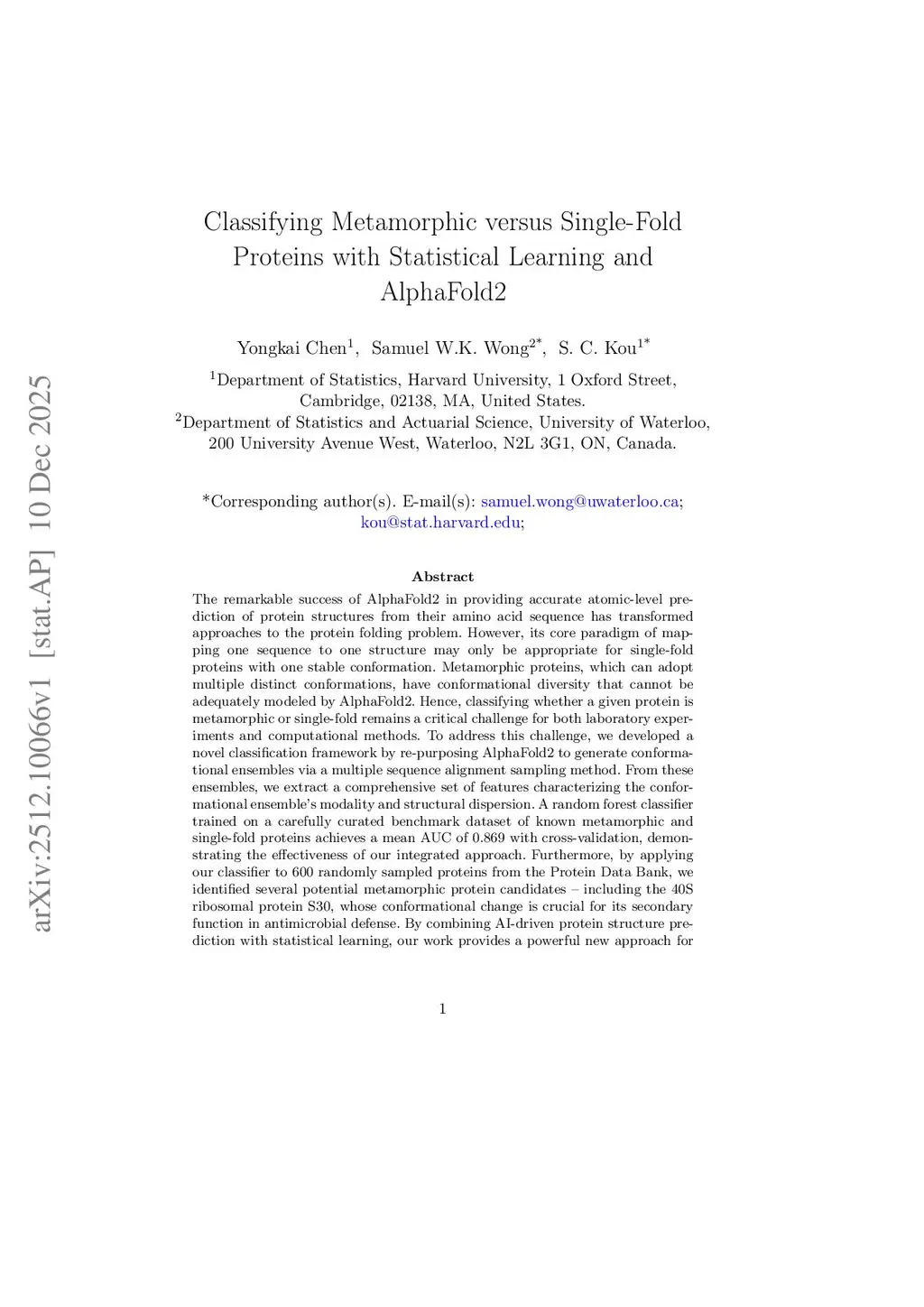Classifying Metamorphic versus Single-Fold Proteins with Statistical Learning and AlphaFold2