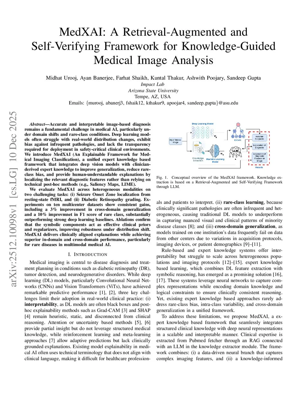 Accurate and interpretable image-based diagnosis remains a fundamental challenge in medical AI, particularly un- der domain shifts and rare-class conditions. Deep learning mod- els often struggle with real-world distribution changes, exhibit bias against infrequent pathologies, and lack the transparency required for deployment in safety-critical clinical environments. We introduce MedXAI (An Explainable Framework for Med- ical Imaging Classification), a unified expert knowledge based framework that integrates deep vision models with clinician- derived expert knowledge to improve generalization, reduce rare- class bias, and provide human-understandable explanations by localizing the relevant diagnostic features rather than relying on technical post-hoc methods (e.g., Saliency Maps, LIME). We evaluate MedXAI across heterogeneous modalities on two challenging tasks: (i) Seizure Onset Zone localization from resting-state fMRI, and (ii) Diabetic Retinopathy grading. Ex periments on ten multicenter datasets show consistent gains, including a 3% improvement in cross-domain generalization and a 10% improvmnet in F1 score of rare class, substantially outperforming strong deep learning baselines. Ablations confirm that the symbolic components act as effective clinical priors and regularizers, improving robustness under distribution shift. MedXAI delivers clinically aligned explanations while achieving superior in-domain and cross-domain performance, particularly for rare diseases in multimodal medical AI.