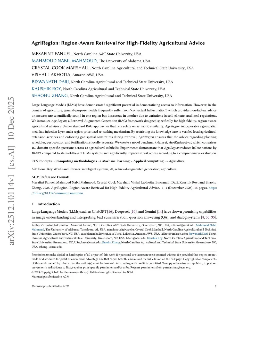 Large Language Models (LLMs) have demonstrated significant potential in democratizing access to information. However, in the domain of agriculture, general-purpose models frequently suffer from contextual hallucination, which provides non-factual advice or answers are scientifically sound in one region but disastrous in another due to variations in soil, climate, and local regulations. We introduce AgriRegion, a Retrieval-Augmented Generation (RAG) framework designed specifically for high-fidelity, region-aware agricultural advisory. Unlike standard RAG approaches that rely solely on semantic similarity, AgriRegion incorporates a geospatial metadata injection layer and a region-prioritized re-ranking mechanism. By restricting the knowledge base to verified local agricultural extension services and enforcing geo-spatial constraints during retrieval, AgriRegion ensures that the advice regarding planting schedules, pest control, and fertilization is locally accurate. We create a novel benchmark dataset, AgriRegion-Eval, which comprises 160 domain-specific questions across 12 agricultural subfields. Experiments demonstrate that AgriRegion reduces hallucinations by 10-20% compared to state-of-the-art LLMs systems and significantly improves trust scores according to a comprehensive evaluation.