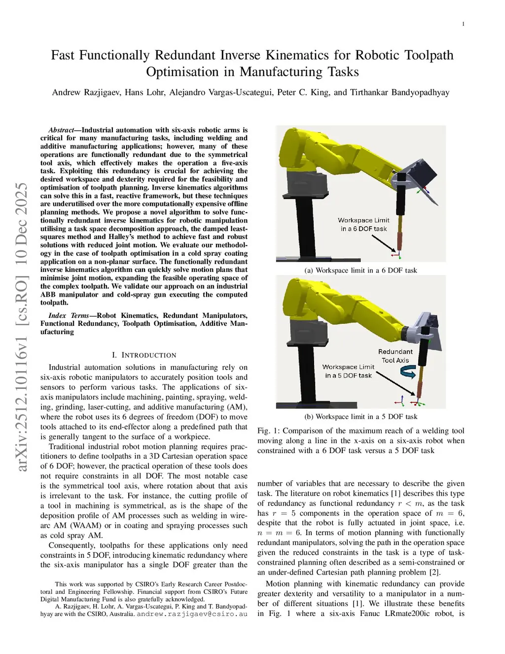 Industrial automation with six-axis robotic arms is critical for many manufacturing tasks, including welding and additive manufacturing applications; however, many of these operations are functionally redundant due to the symmetrical tool axis, which effectively makes the operation a five-axis task. Exploiting this redundancy is crucial for achieving the desired workspace and dexterity required for the feasibility and optimisation of toolpath planning. Inverse kinematics algorithms can solve this in a fast, reactive framework, but these techniques are underutilised over the more computationally expensive offline planning methods. We propose a novel algorithm to solve functionally redundant inverse kinematics for robotic manipulation utilising a task space decomposition approach, the damped least-squares method and Halley's method to achieve fast and robust solutions with reduced joint motion. We evaluate our methodology in the case of toolpath optimisation in a cold spray coating application on a non-planar surface. The functionally redundant inverse kinematics algorithm can quickly solve motion plans that minimise joint motion, expanding the feasible operating space of the complex toolpath. We validate our approach on an industrial ABB manipulator and cold-spray gun executing the computed toolpath.