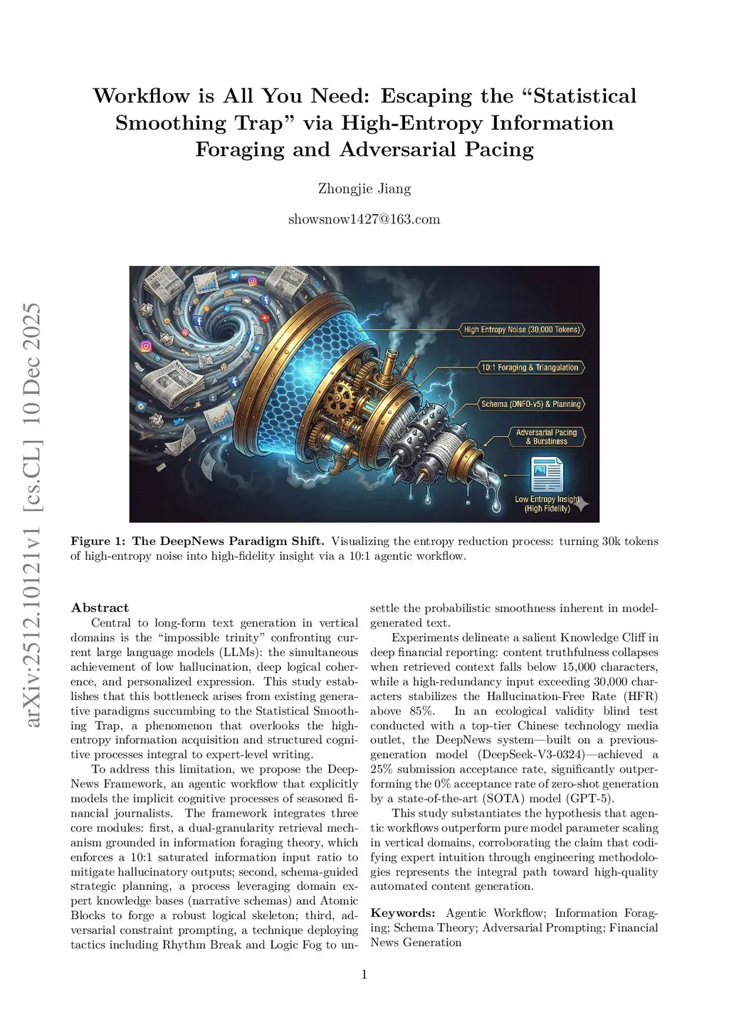Central to long-form text generation in vertical domains is the "impossible trinity" confronting current large language models (LLMs): the simultaneous achievement of low hallucination, deep logical coherence, and personalized expression. This study establishes that this bottleneck arises from existing generative paradigms succumbing to the Statistical Smoothing Trap, a phenomenon that overlooks the high-entropy information acquisition and structured cognitive processes integral to expert-level writing. To address this limitation, we propose the DeepNews Framework, an agentic workflow that explicitly models the implicit cognitive processes of seasoned financial journalists. The framework integrates three core modules: first, a dual-granularity retrieval mechanism grounded in information foraging theory, which enforces a 10:1 saturated information input ratio to mitigate hallucinatory outputs; second, schema-guided strategic planning, a process leveraging domain expert knowledge bases (narrative schemas) and Atomic Blocks to forge a robust logical skeleton; third, adversarial constraint prompting, a technique deploying tactics including Rhythm Break and Logic Fog to disrupt the probabilistic smoothness inherent in model-generated text. Experiments delineate a salient Knowledge Cliff in deep financial reporting: content truthfulness collapses when retrieved context falls below 15,000 characters, while a high-redundancy input exceeding 30,000 characters stabilizes the Hallucination-Free Rate (HFR) above 85%. In an ecological validity blind test conducted with a top-tier Chinese technology media outlet, the DeepNews system--built on a previous-generation model (DeepSeek-V3-0324)-achieved a 25% submission acceptance rate, significantly outperforming the 0% acceptance rate of zero-shot generation by a state-of-the-art (SOTA) model (GPT-5).