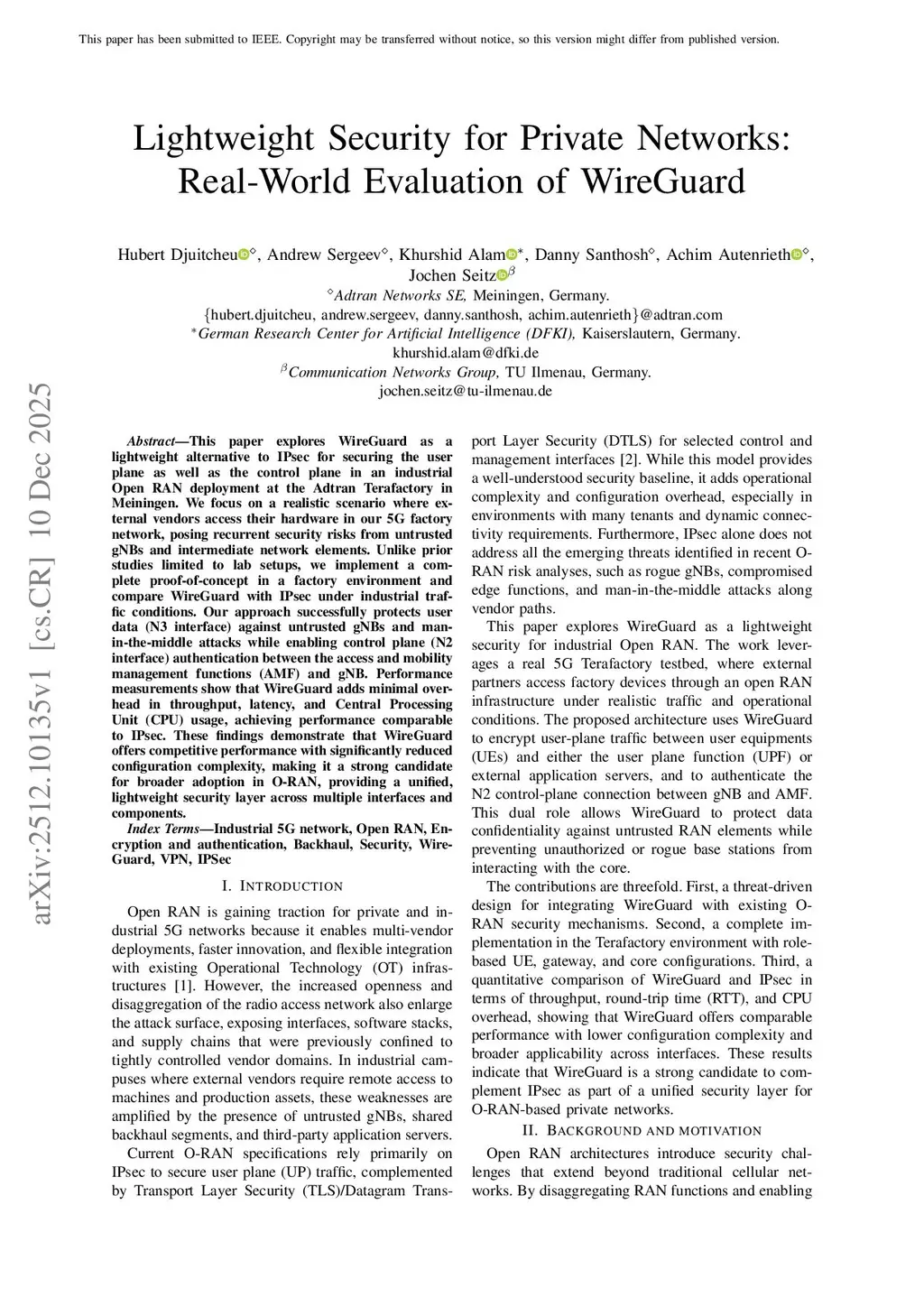 This paper explores WireGuard as a lightweight alternative to IPsec for securing the user plane as well as the control plane in an industrial Open RAN deployment at the Adtran Terafactory in Meiningen. We focus on a realistic scenario where external vendors access their hardware in our 5G factory network, posing recurrent security risks from untrusted gNBs and intermediate network elements. Unlike prior studies limited to lab setups, we implement a complete proof-of-concept in a factory environment and compare WireGuard with IPsec under industrial traffic conditions. Our approach successfully protects user data (N3 interface) against untrusted gNBs and man-in-the-middle attacks while enabling control plane (N2 interface) authentication between the access and mobility management functions (AMF) and gNB. Performance measurements show that WireGuard adds minimal overhead in throughput, latency, and Central Processing Unit (CPU) usage, achieving performance comparable to IPsec. These findings demonstrate that WireGuard offers competitive performance with significantly reduced configuration complexity, making it a strong candidate for broader adoption in O-RAN, providing a unified, lightweight security layer across multiple interfaces and components.