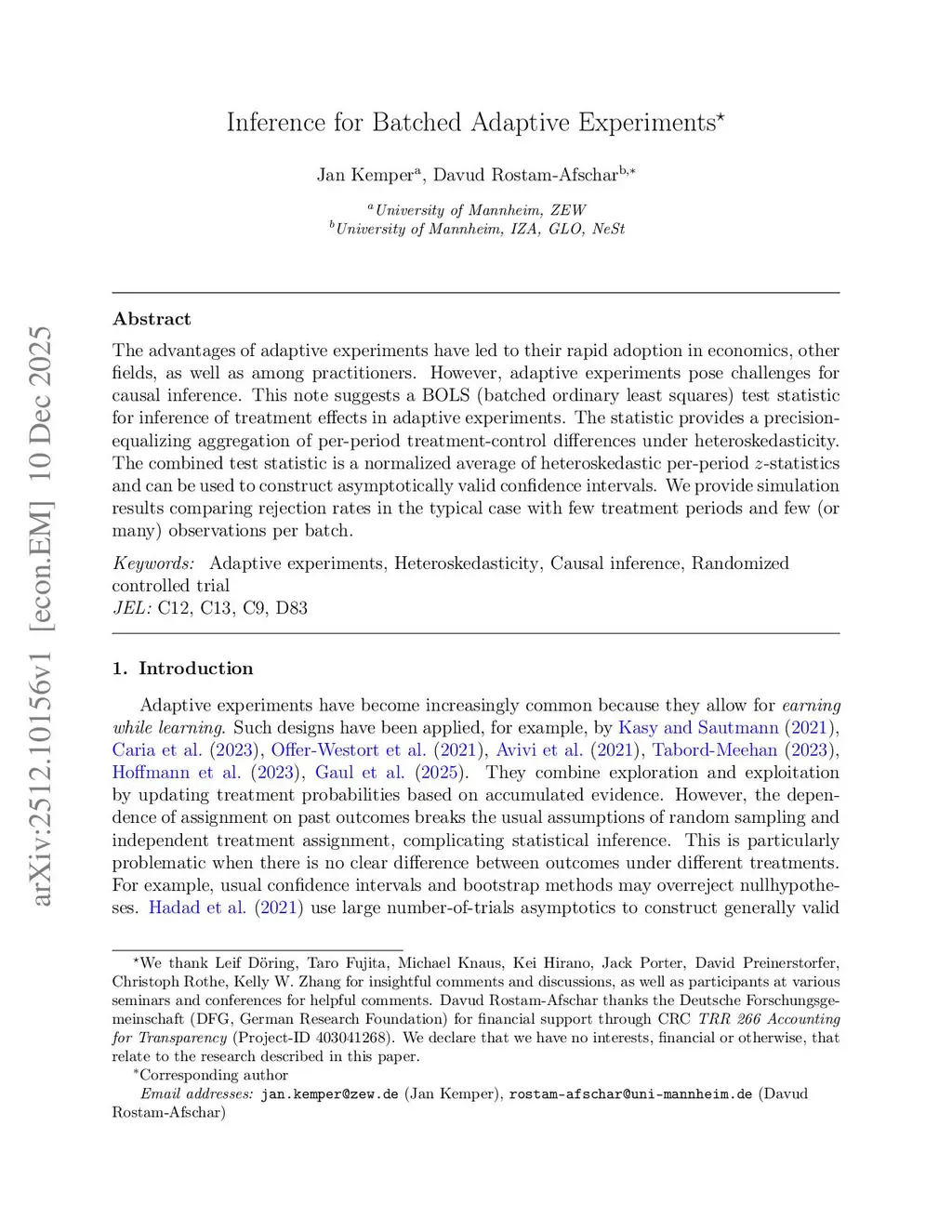 The advantages of adaptive experiments have led to their rapid adoption in economics, other fields, as well as among practitioners. However, adaptive experiments pose challenges for causal inference. This note suggests a BOLS (batched ordinary least squares) test statistic for inference of treatment effects in adaptive experiments. The statistic provides a precision-equalizing aggregation of per-period treatment-control differences under heteroskedasticity. The combined test statistic is a normalized average of heteroskedastic per-period z-statistics and can be used to construct asymptotically valid confidence intervals. We provide simulation results comparing rejection rates in the typical case with few treatment periods and few (or many) observations per batch.
