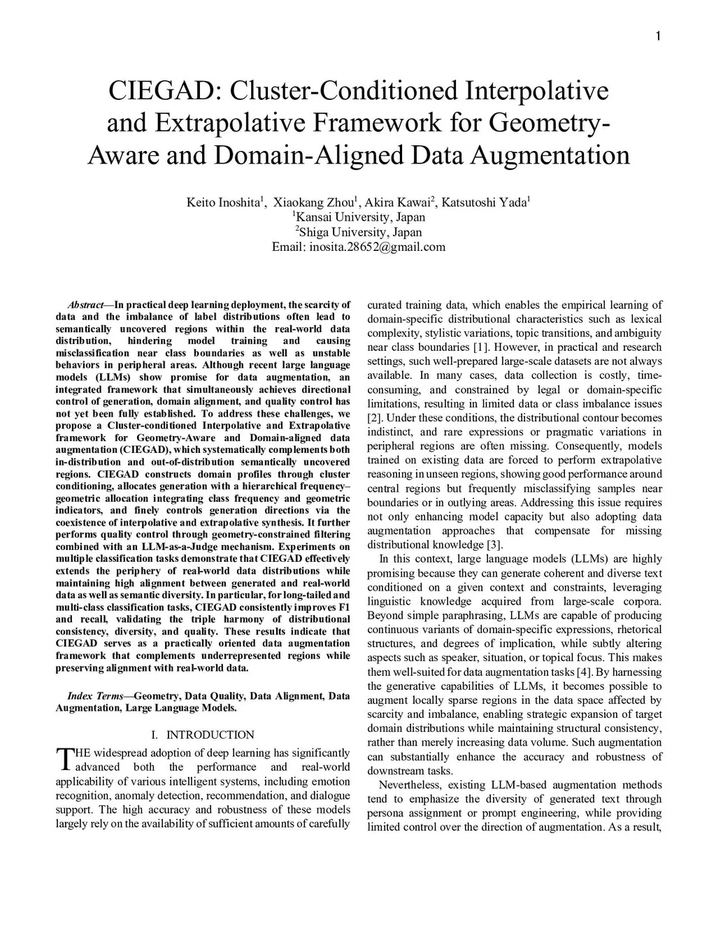 In practical deep learning deployment, the scarcity of data and the imbalance of label distributions often lead to semantically uncovered regions within the real-world data distribution, hindering model training and causing misclassification near class boundaries as well as unstable behaviors in peripheral areas. Although recent large language models (LLMs) show promise for data augmentation, an integrated framework that simultaneously achieves directional control of generation, domain alignment, and quality control has not yet been fully established. To address these challenges, we propose a Cluster-conditioned Interpolative and Extrapolative framework for Geometry-Aware and Domain-aligned data augmentation (CIEGAD), which systematically complements both in-distribution and out-of-distribution semantically uncovered regions. CIEGAD constructs domain profiles through cluster conditioning, allocates generation with a hierarchical frequency-geometric allocation integrating class frequency and geometric indicators, and finely controls generation directions via the coexistence of interpolative and extrapolative synthesis. It further performs quality control through geometry-constrained filtering combined with an LLM-as-a-Judge mechanism. Experiments on multiple classification tasks demonstrate that CIEGAD effectively extends the periphery of real-world data distributions while maintaining high alignment between generated and real-world data as well as semantic diversity. In particular, for long-tailed and multi-class classification tasks, CIEGAD consistently improves F1 and recall, validating the triple harmony of distributional consistency, diversity, and quality. These results indicate that CIEGAD serves as a practically oriented data augmentation framework that complements underrepresented regions while preserving alignment with real-world data.