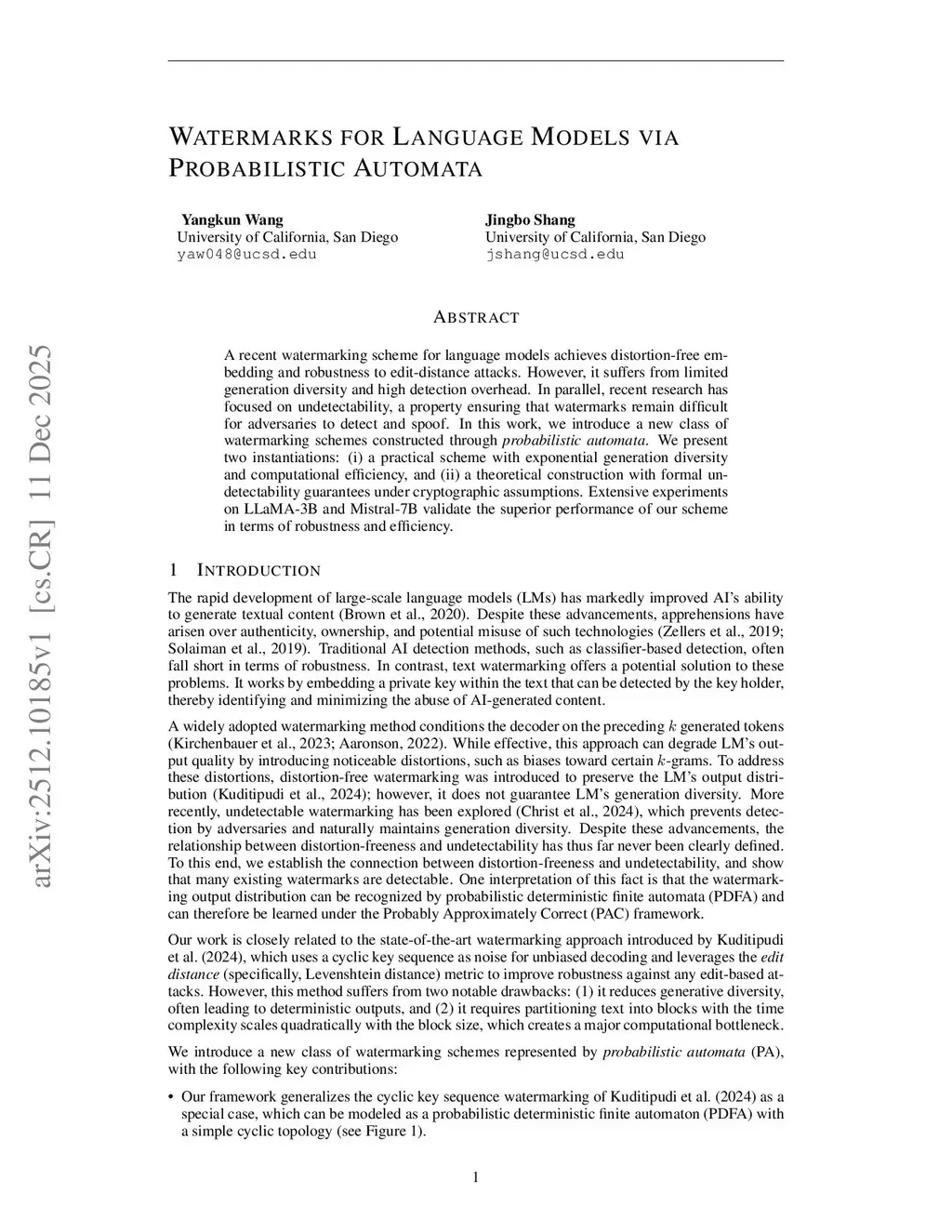 A recent watermarking scheme for language models achieves distortion-free embedding and robustness to edit-distance attacks. However, it suffers from limited generation diversity and high detection overhead. In parallel, recent research has focused on undetectability, a property ensuring that watermarks remain difficult for adversaries to detect and spoof. In this work, we introduce a new class of watermarking schemes constructed through probabilistic automata. We present two instantiations: (i) a practical scheme with exponential generation diversity and computational efficiency, and (ii) a theoretical construction with formal undetectability guarantees under cryptographic assumptions. Extensive experiments on LLaMA-3B and Mistral-7B validate the superior performance of our scheme in terms of robustness and efficiency.