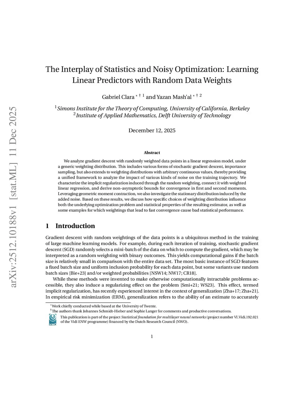 The Interplay of Statistics and Noisy Optimization: Learning Linear Predictors with Random Data Weights