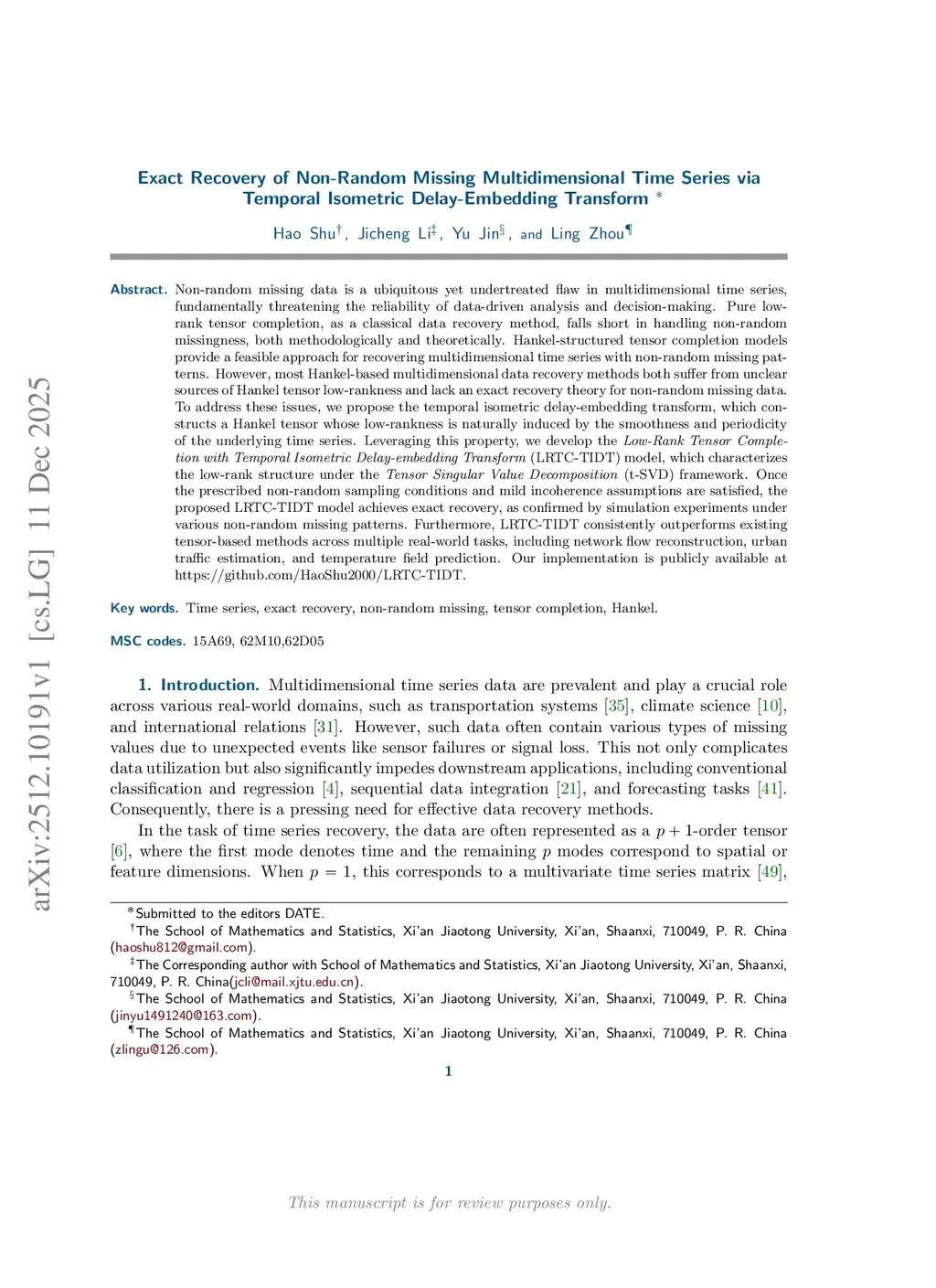 Non-random missing data is a ubiquitous yet undertreated flaw in multidimensional time series, fundamentally threatening the reliability of data-driven analysis and decision-making. Pure low-rank tensor completion, as a classical data recovery method, falls short in handling non-random missingness, both methodologically and theoretically. Hankel-structured tensor completion models provide a feasible approach for recovering multidimensional time series with non-random missing patterns. However, most Hankel-based multidimensional data recovery methods both suffer from unclear sources of Hankel tensor low-rankness and lack an exact recovery theory for non-random missing data. To address these issues, we propose the temporal isometric delay-embedding transform, which constructs a Hankel tensor whose low-rankness is naturally induced by the smoothness and periodicity of the underlying time series. Leveraging this property, we develop the \textit{Low-Rank Tensor Completion with Temporal Isometric Delay-embedding Transform} (LRTC-TIDT) model, which characterizes the low-rank structure under the \textit{Tensor Singular Value Decomposition} (t-SVD) framework. Once the prescribed non-random sampling conditions and mild incoherence assumptions are satisfied, the proposed LRTC-TIDT model achieves exact recovery, as confirmed by simulation experiments under various non-random missing patterns. Furthermore, LRTC-TIDT consistently outperforms existing tensor-based methods across multiple real-world tasks, including network flow reconstruction, urban traffic estimation, and temperature field prediction. Our implementation is publicly available atthis https URL.