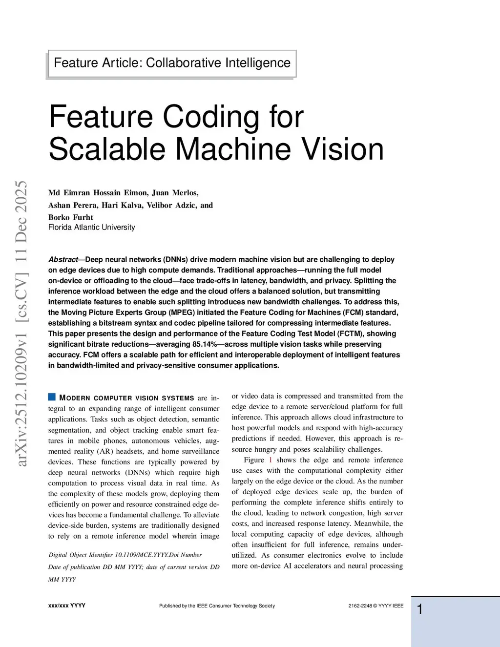 Deep neural networks (DNNs) drive modern machine vision but are challenging to deploy on edge devices due to high compute demands. Traditional approaches-running the full model on-device or offloading to the cloud face trade-offs in latency, bandwidth, and privacy. Splitting the inference workload between the edge and the cloud offers a balanced solution, but transmitting intermediate features to enable such splitting introduces new bandwidth challenges. To address this, the Moving Picture Experts Group (MPEG) initiated the Feature Coding for Machines (FCM) standard, establishing a bitstream syntax and codec pipeline tailored for compressing intermediate features. This paper presents the design and performance of the Feature Coding Test Model (FCTM), showing significant bitrate reductions-averaging 85.14%-across multiple vision tasks while preserving accuracy. FCM offers a scalable path for efficient and interoperable deployment of intelligent features in bandwidth-limited and privacy-sensitive consumer applications.