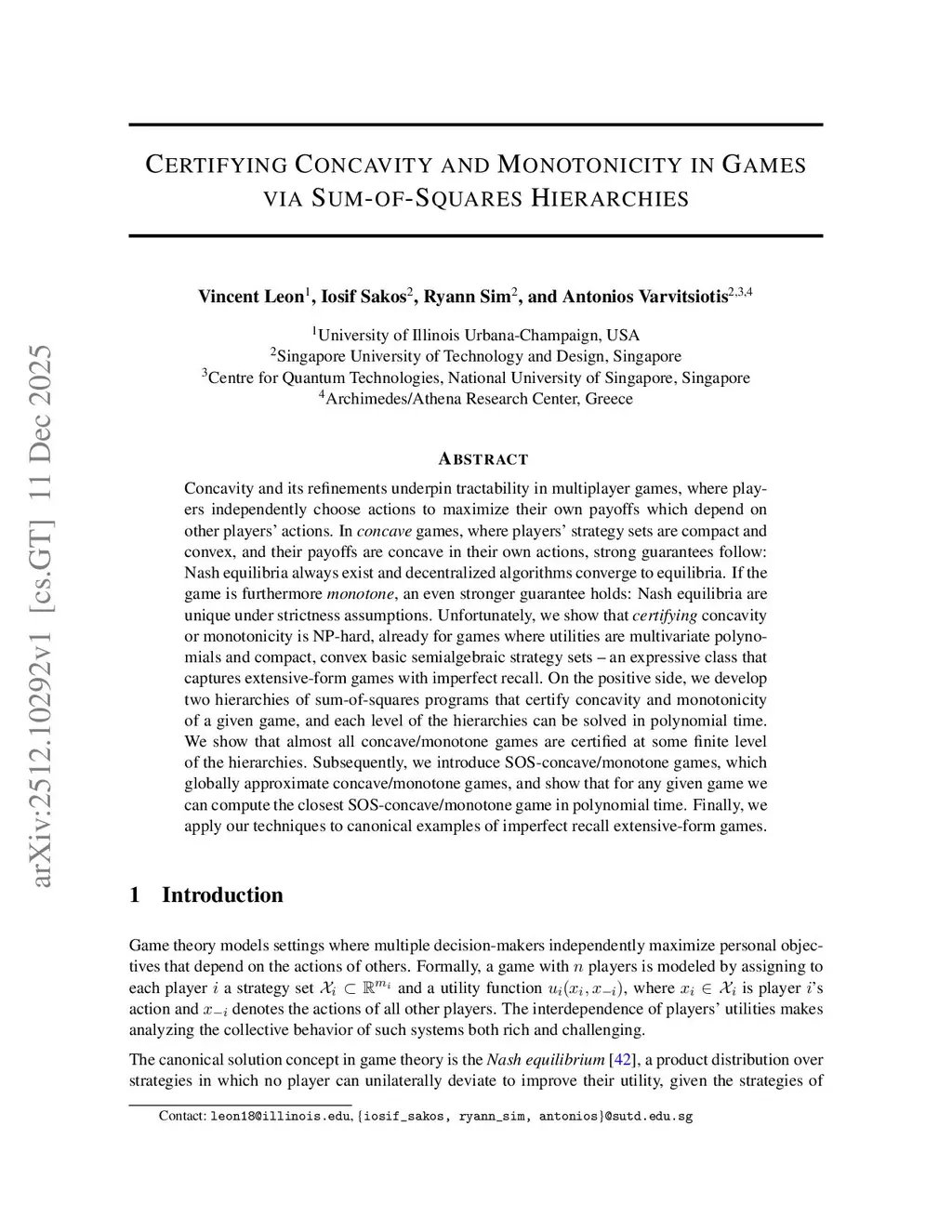 Concavity and its refinements underpin tractability in multiplayer games, where players independently choose actions to maximize their own payoffs which depend on other players' actions. In concave games, where players' strategy sets are compact and convex, and their payoffs are concave in their own actions, strong guarantees follow: Nash equilibria always exist and decentralized algorithms converge to equilibria. If the game is furthermore monotone, an even stronger guarantee holds: Nash equilibria are unique under strictness assumptions. Unfortunately, we show that certifying concavity or monotonicity is NP-hard, already for games where utilities are multivariate polynomials and compact, convex basic semialgebraic strategy sets -- an expressive class that captures extensive-form games with imperfect recall. On the positive side, we develop two hierarchies of sum-of-squares programs that certify concavity and monotonicity of a given game, and each level of the hierarchies can be solved in polynomial time. We show that almost all concave/monotone games are certified at some finite level of the hierarchies. Subsequently, we introduce SOS-concave/monotone games, which globally approximate concave/monotone games, and show that for any given game we can compute the closest SOS-concave/monotone game in polynomial time. Finally, we apply our techniques to canonical examples of imperfect recall extensive-form games.