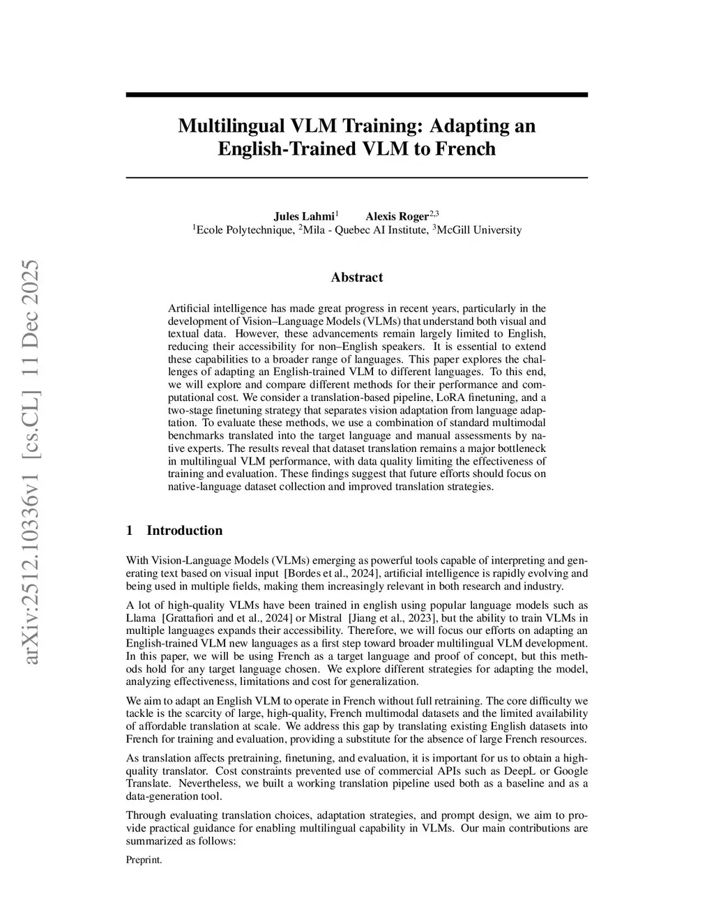 Multilingual VLM Training: Adapting an English-Trained VLM to French