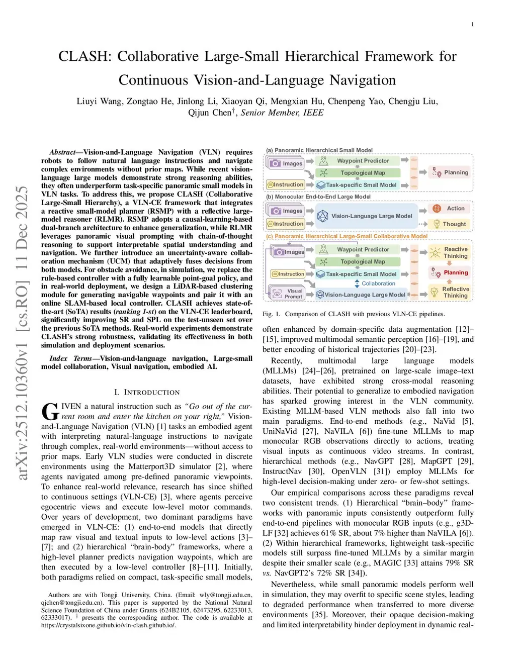 Vision-and-Language Navigation (VLN) requires robots to follow natural language instructions and navigate complex environments without prior maps. While recent vision-language large models demonstrate strong reasoning abilities, they often underperform task-specific panoramic small models in VLN tasks. To address this, we propose CLASH (Collaborative Large-Small Hierarchy), a VLN-CE framework that integrates a reactive small-model planner (RSMP) with a reflective large-model reasoner (RLMR). RSMP adopts a causal-learning-based dual-branch architecture to enhance generalization, while RLMR leverages panoramic visual prompting with chain-of-thought reasoning to support interpretable spatial understanding and navigation. We further introduce an uncertainty-aware collaboration mechanism (UCM) that adaptively fuses decisions from both models. For obstacle avoidance, in simulation, we replace the rule-based controller with a fully learnable point-goal policy, and in real-world deployment, we design a LiDAR-based clustering module for generating navigable waypoints and pair it with an online SLAM-based local controller. CLASH achieves state-of-the-art (SoTA) results (ranking 1-st) on the VLN-CE leaderboard, significantly improving SR and SPL on the test-unseen set over the previous SoTA methods. Real-world experiments demonstrate CLASH's strong robustness, validating its effectiveness in both simulation and deployment scenarios.