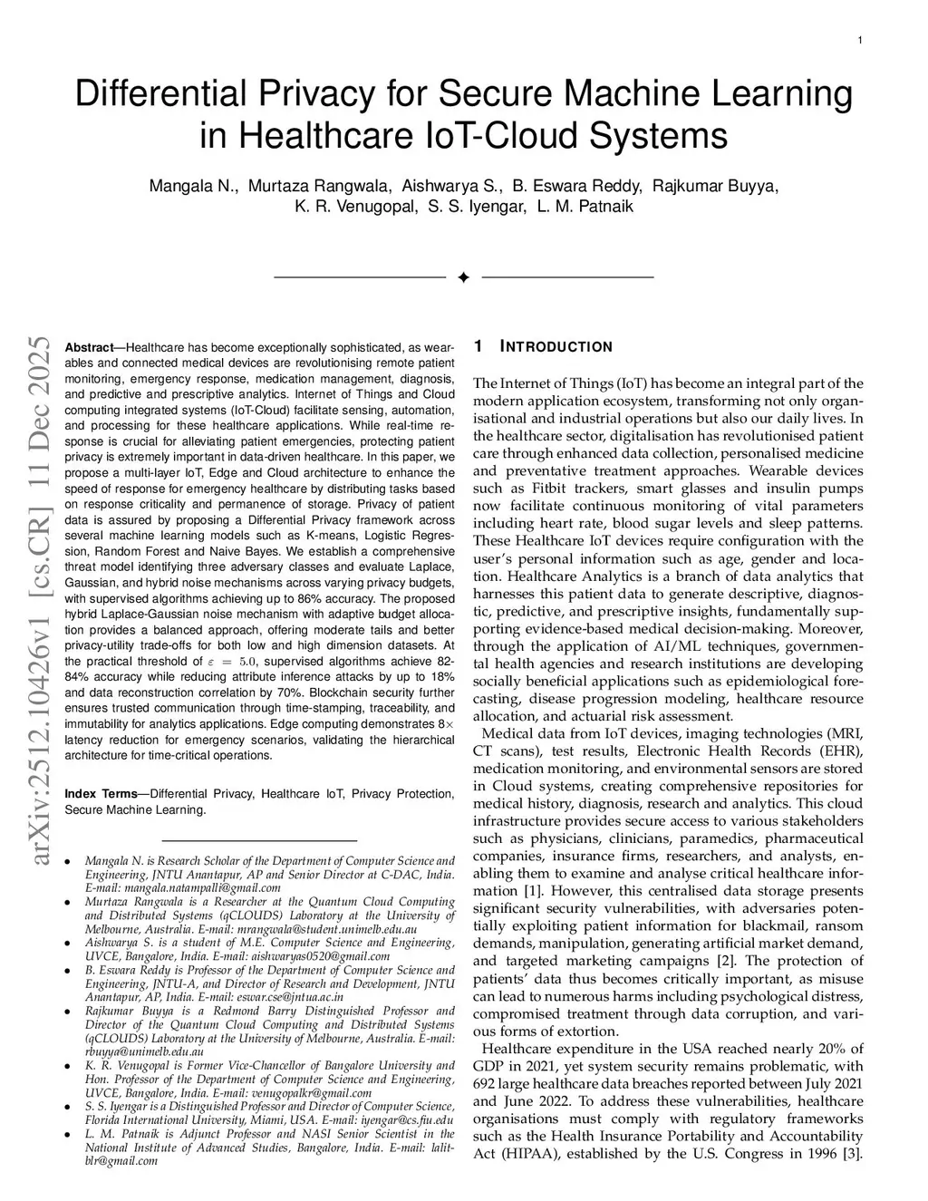 Healthcare has become exceptionally sophisticated, as wearables and connected medical devices are revolutionising remote patient monitoring, emergency response, medication management, diagnosis, and predictive and prescriptive analytics. Internet of Things and Cloud computing integrated systems (IoT-Cloud) facilitate sensing, automation, and processing for these healthcare applications. While real-time response is crucial for alleviating patient emergencies, protecting patient privacy is extremely important in data-driven healthcare. In this paper, we propose a multi-layer IoT, Edge and Cloud architecture to enhance the speed of response for emergency healthcare by distributing tasks based on response criticality and permanence of storage. Privacy of patient data is assured by proposing a Differential Privacy framework across several machine learning models such as K-means, Logistic Regression, Random Forest and Naive Bayes. We establish a comprehensive threat model identifying three adversary classes and evaluate Laplace, Gaussian, and hybrid noise mechanisms across varying privacy budgets, with supervised algorithms achieving up to 86% accuracy. The proposed hybrid Laplace-Gaussian noise mechanism with adaptive budget allocation provides a balanced approach, offering moderate tails and better privacy-utility trade-offs for both low and high dimension datasets. At the practical threshold of , supervised algorithms achieve 82-84% accuracy while reducing attribute inference attacks by up to 18% and data reconstruction correlation by 70%. Blockchain security further ensures trusted communication through time-stamping, traceability, and immutability for analytics applications. Edge computing demonstrates 8 latency reduction for emergency scenarios, validating the hierarchical architecture for time-critical operations.