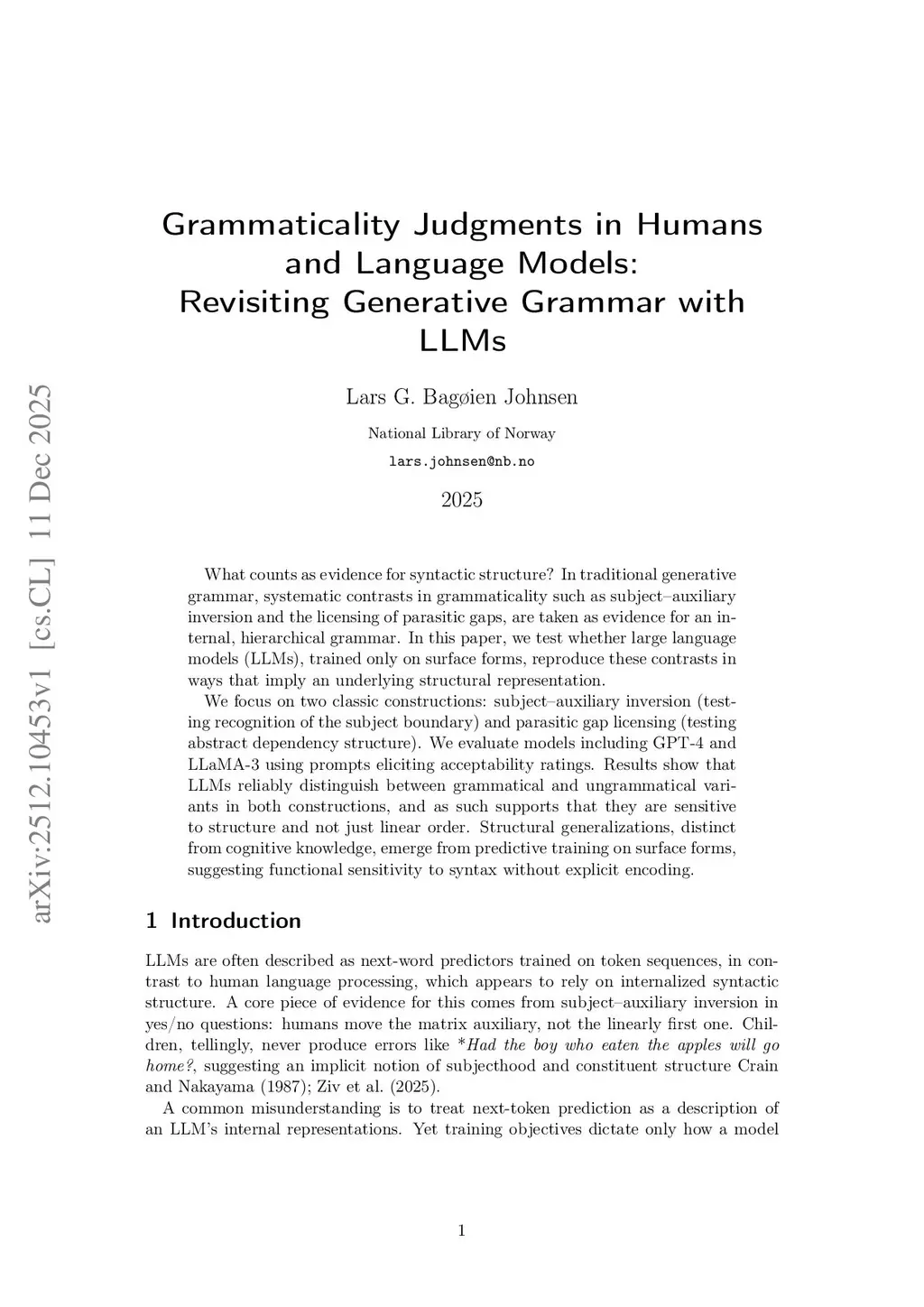 What counts as evidence for syntactic structure? In traditional generative grammar, systematic contrasts in grammaticality such as subject-auxiliary inversion and the licensing of parasitic gaps are taken as evidence for an internal, hierarchical grammar. In this paper, we test whether large language models (LLMs), trained only on surface forms, reproduce these contrasts in ways that imply an underlying structural representation.We focus on two classic constructions: subject-auxiliary inversion (testing recognition of the subject boundary) and parasitic gap licensing (testing abstract dependency structure). We evaluate models including GPT-4 and LLaMA-3 using prompts eliciting acceptability ratings. Results show that LLMs reliably distinguish between grammatical and ungrammatical variants in both constructions, and as such support that they are sensitive to structure and not just linear order. Structural generalizations, distinct from cognitive knowledge, emerge from predictive training on surface forms, suggesting functional sensitivity to syntax without explicit encoding.