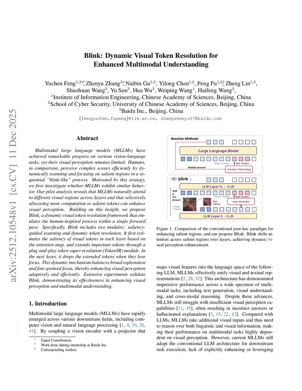 Multimodal large language models (MLLMs) have achieved remarkable progress on various vision-language tasks, yet their visual perception remains limited. Humans, in comparison, perceive complex scenes efficiently by dynamically scanning and focusing on salient regions in a sequential "blink-like" process. Motivated by this strategy, we first investigate whether MLLMs exhibit similar behavior. Our pilot analysis reveals that MLLMs naturally attend to different visual regions across layers and that selectively allocating more computation to salient tokens can enhance visual perception. Building on this insight, we propose Blink, a dynamic visual token resolution framework that emulates the human-inspired process within a single forward pass. Specifically, Blink includes two modules: saliency-guided scanning and dynamic token resolution. It first estimates the saliency of visual tokens in each layer based on the attention map, and extends important tokens through a plug-and-play token super-resolution (TokenSR) module. In the next layer, it drops the extended tokens when they lose focus. This dynamic mechanism balances broad exploration and fine-grained focus, thereby enhancing visual perception adaptively and efficiently. Extensive experiments validate Blink, demonstrating its effectiveness in enhancing visual perception and multimodal understanding.