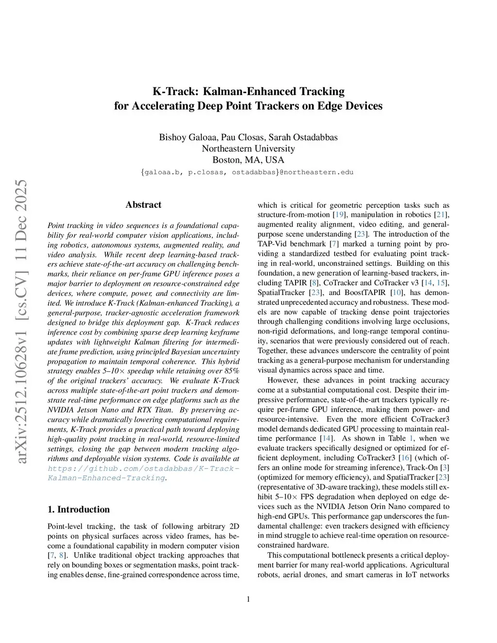Point tracking in video sequences is a foundational capability for real-world computer vision applications, including robotics, autonomous systems, augmented reality, and video analysis. While recent deep learning-based trackers achieve state-of-the-art accuracy on challenging benchmarks, their reliance on per-frame GPU inference poses a major barrier to deployment on resource-constrained edge devices, where compute, power, and connectivity are limited. We introduce K-Track (Kalman-enhanced Tracking), a general-purpose, tracker-agnostic acceleration framework designed to bridge this deployment gap. K-Track reduces inference cost by combining sparse deep learning keyframe updates with lightweight Kalman filtering for intermediate frame prediction, using principled Bayesian uncertainty propagation to maintain temporal coherence. This hybrid strategy enables 5-10X speedup while retaining over 85% of the original trackers' accuracy. We evaluate K-Track across multiple state-of-the-art point trackers and demonstrate real-time performance on edge platforms such as the NVIDIA Jetson Nano and RTX Titan. By preserving accuracy while dramatically lowering computational requirements, K-Track provides a practical path toward deploying high-quality point tracking in real-world, resource-limited settings, closing the gap between modern tracking algorithms and deployable vision systems.
