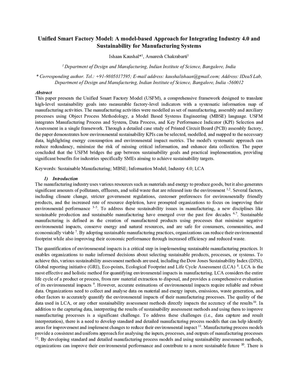 This paper presents the Unified Smart Factory Model (USFM), a comprehensive framework designed to translate high-level sustainability goals into measurable factory-level indicators with a systematic information map of manufacturing activities. The manufacturing activities were modelled as set of manufacturing, assembly and auxiliary processes using Object Process Methodology, a Model Based Systems Engineering (MBSE) language. USFM integrates Manufacturing Process and System, Data Process, and Key Performance Indicator (KPI) Selection and Assessment in a single framework. Through a detailed case study of Printed Circuit Board (PCB) assembly factory, the paper demonstrates how environmental sustainability KPIs can be selected, modelled, and mapped to the necessary data, highlighting energy consumption and environmental impact metrics. The model's systematic approach can reduce redundancy, minimize the risk of missing critical information, and enhance data collection. The paper concluded that the USFM bridges the gap between sustainability goals and practical implementation, providing significant benefits for industries specifically SMEs aiming to achieve sustainability targets.