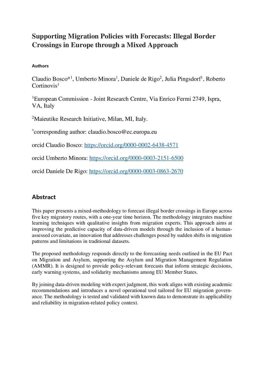 This paper presents a mixed-methodology to forecast illegal border crossings in Europe across five key migratory routes, with a one-year time horizon. The methodology integrates machine learning techniques with qualitative insights from migration experts. This approach aims at improving the predictive capacity of data-driven models through the inclusion of a human-assessed covariate, an innovation that addresses challenges posed by sudden shifts in migration patterns and limitations in traditional datasets. The proposed methodology responds directly to the forecasting needs outlined in the EU Pact on Migration and Asylum, supporting the Asylum and Migration Management Regulation (AMMR). It is designed to provide policy-relevant forecasts that inform strategic decisions, early warning systems, and solidarity mechanisms among EU Member States. By joining data-driven modeling with expert judgment, this work aligns with existing academic recommendations and introduces a novel operational tool tailored for EU migration governance. The methodology is tested and validated with known data to demonstrate its applicability and reliability in migration-related policy context.