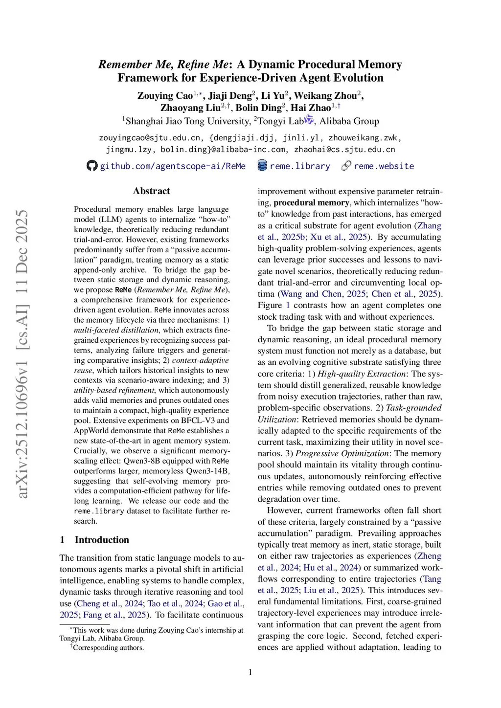 Procedural memory enables large language model (LLM) agents to internalize "how-to" knowledge, theoretically reducing redundant trial-and-error. However, existing frameworks predominantly suffer from a "passive accumulation" paradigm, treating memory as a static append-only archive. To bridge the gap between static storage and dynamic reasoning, we propose (), a comprehensive framework for experience-driven agent evolution. ReMe innovates across the memory lifecycle via three mechanisms: 1) , which extracts fine-grained experiences by recognizing success patterns, analyzing failure triggers and generating comparative insights; 2) , which tailors historical insights to new contexts via scenario-aware indexing; and 3) , which autonomously adds valid memories and prunes outdated ones to maintain a compact, high-quality experience pool. Extensive experiments on BFCL-V3 and AppWorld demonstrate that ReMe establishes a new state-of-the-art in agent memory system. Crucially, we observe a significant memory-scaling effect: Qwen3-8B equipped with ReMe outperforms larger, memoryless Qwen3-14B, suggesting that self-evolving memory provides a computation-efficient pathway for lifelong learning. We release our code and the dataset to facilitate further research.