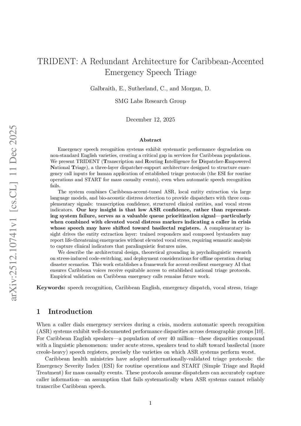 Emergency speech recognition systems exhibit systematic performance degradation on non-standard English varieties, creating a critical gap in services for Caribbean populations. We present TRIDENT (Transcription and Routing Intelligence for Dispatcher-Empowered National Triage), a three-layer dispatcher-support architecture designed to structure emergency call inputs for human application of established triage protocols (the ESI for routine operations and START for mass casualty events), even when automatic speech recognition fails.The system combines Caribbean-accent-tuned ASR, local entity extraction via large language models, and bio-acoustic distress detection to provide dispatchers with three complementary signals: transcription confidence, structured clinical entities, and vocal stress indicators. Our key insight is that low ASR confidence, rather than representing system failure, serves as a valuable queue prioritization signal -- particularly when combined with elevated vocal distress markers indicating a caller in crisis whose speech may have shifted toward basilectal registers. A complementary insight drives the entity extraction layer: trained responders and composed bystanders may report life-threatening emergencies without elevated vocal stress, requiring semantic analysis to capture clinical indicators that paralinguistic features miss.We describe the architectural design, theoretical grounding in psycholinguistic research on stress-induced code-switching, and deployment considerations for offline operation during disaster scenarios. This work establishes a framework for accent-resilient emergency AI that ensures Caribbean voices receive equitable access to established national triage protocols. Empirical validation on Caribbean emergency calls remains future work.