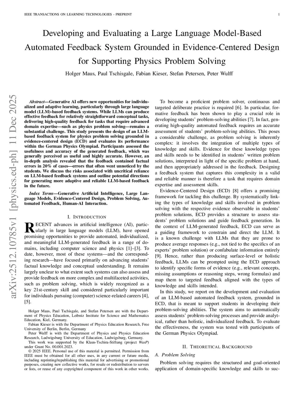 Generative AI offers new opportunities for individualized and adaptive learning, e.g., through large language model (LLM)-based feedback systems. While LLMs can produce effective feedback for relatively straightforward conceptual tasks, delivering high-quality feedback for tasks that require advanced domain expertise, such as physics problem solving, remains a substantial challenge. This study presents the design of an LLM-based feedback system for physics problem solving grounded in evidence-centered design (ECD) and evaluates its performance within the German Physics Olympiad. Participants assessed the usefulness and accuracy of the generated feedback, which was generally perceived as useful and highly accurate. However, an in-depth analysis revealed that the feedback contained errors in 20% of cases; errors that often went unnoticed by the students. We discuss the risks associated with uncritical reliance on LLM-based feedback and outline potential directions for generating more adaptive and reliable LLM-based feedback in the future.