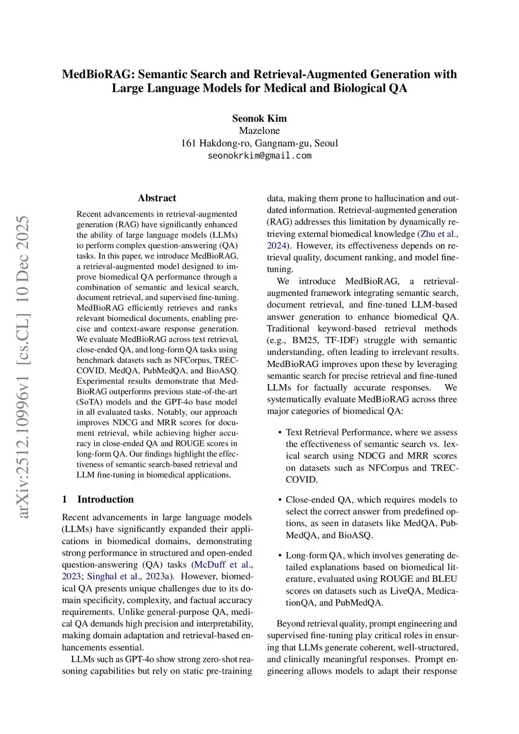 MedBioRAG: Semantic Search and Retrieval-Augmented Generation with Large Language Models for Medical and Biological QA