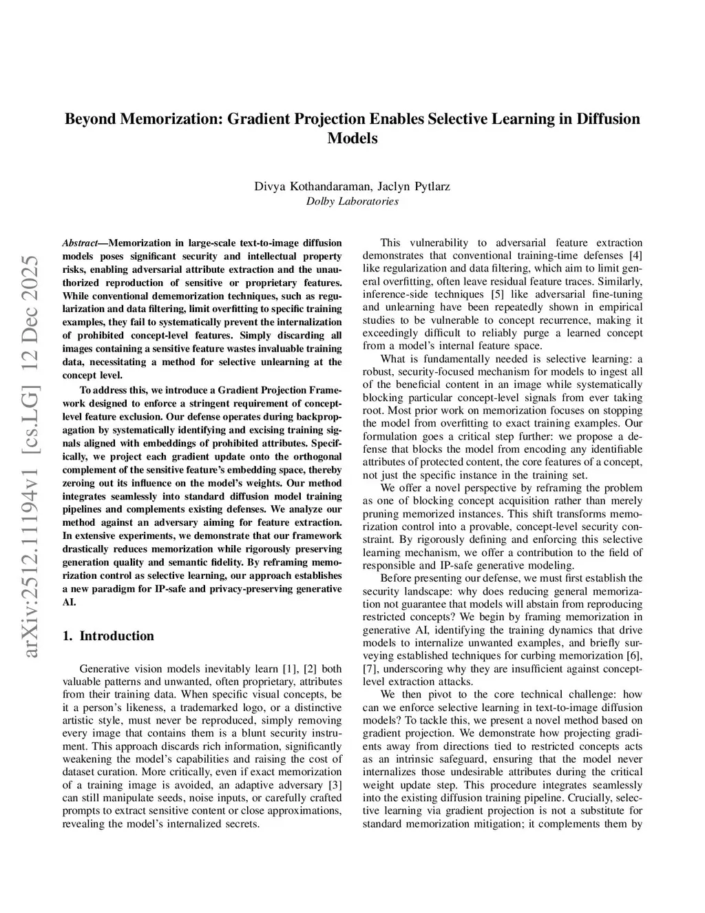 Memorization in large-scale text-to-image diffusion models poses significant security and intellectual property risks, enabling adversarial attribute extraction and the unauthorized reproduction of sensitive or proprietary features. While conventional dememorization techniques, such as regularization and data filtering, limit overfitting to specific training examples, they fail to systematically prevent the internalization of prohibited concept-level features. Simply discarding all images containing a sensitive feature wastes invaluable training data, necessitating a method for selective learning at the concept level.We introduce a gradient projection method designed to enforce a stringent requirement of concept-level feature exclusion. Our defense operates during backpropagation by systematically identifying and excising training signals aligned with embeddings of prohibited attributes. Specifically, we project each gradient update onto the orthogonal complement of the sensitive feature's embedding space, thereby zeroing out its influence on the model's weights. Our method integrates seamlessly into standard diffusion model training pipelines and complements existing defenses. We analyze our method against an adversary aiming for feature extraction. In extensive experiments, we demonstrate that our framework drastically reduces memorization while rigorously preserving generation quality and semantic fidelity. By reframing memorization control as selective learning, our approach establishes a new paradigm for IP-safe and privacy-preserving generative AI.