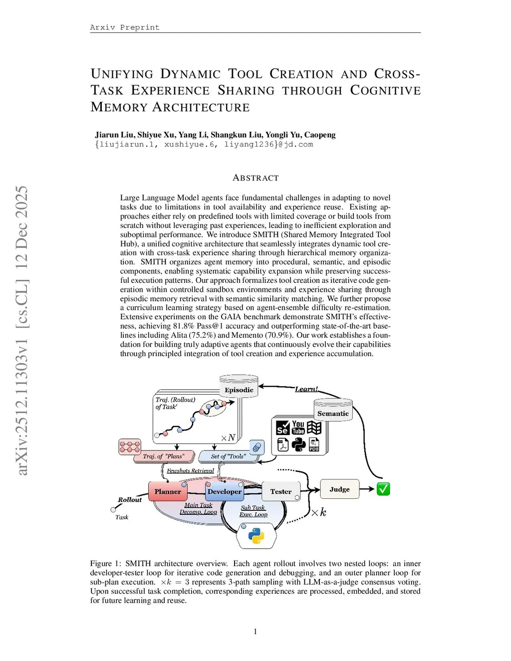 Large Language Model agents face fundamental challenges in adapting to novel tasks due to limitations in tool availability and experience reuse. Existing approaches either rely on predefined tools with limited coverage or build tools from scratch without leveraging past experiences, leading to inefficient exploration and suboptimal performance. We introduce SMITH (Shared Memory Integrated Tool Hub), a unified cognitive architecture that seamlessly integrates dynamic tool creation with cross-task experience sharing through hierarchical memory organization. SMITH organizes agent memory into procedural, semantic, and episodic components, enabling systematic capability expansion while preserving successful execution patterns. Our approach formalizes tool creation as iterative code generation within controlled sandbox environments and experience sharing through episodic memory retrieval with semantic similarity matching. We further propose a curriculum learning strategy based on agent-ensemble difficulty re-estimation. Extensive experiments on the GAIA benchmark demonstrate SMITH's effectiveness, achieving 81.8% Pass@1 accuracy and outperforming state-of-the-art baselines including Alita (75.2%) and Memento (70.9%). Our work establishes a foundation for building truly adaptive agents that continuously evolve their capabilities through principled integration of tool creation and experience accumulation.