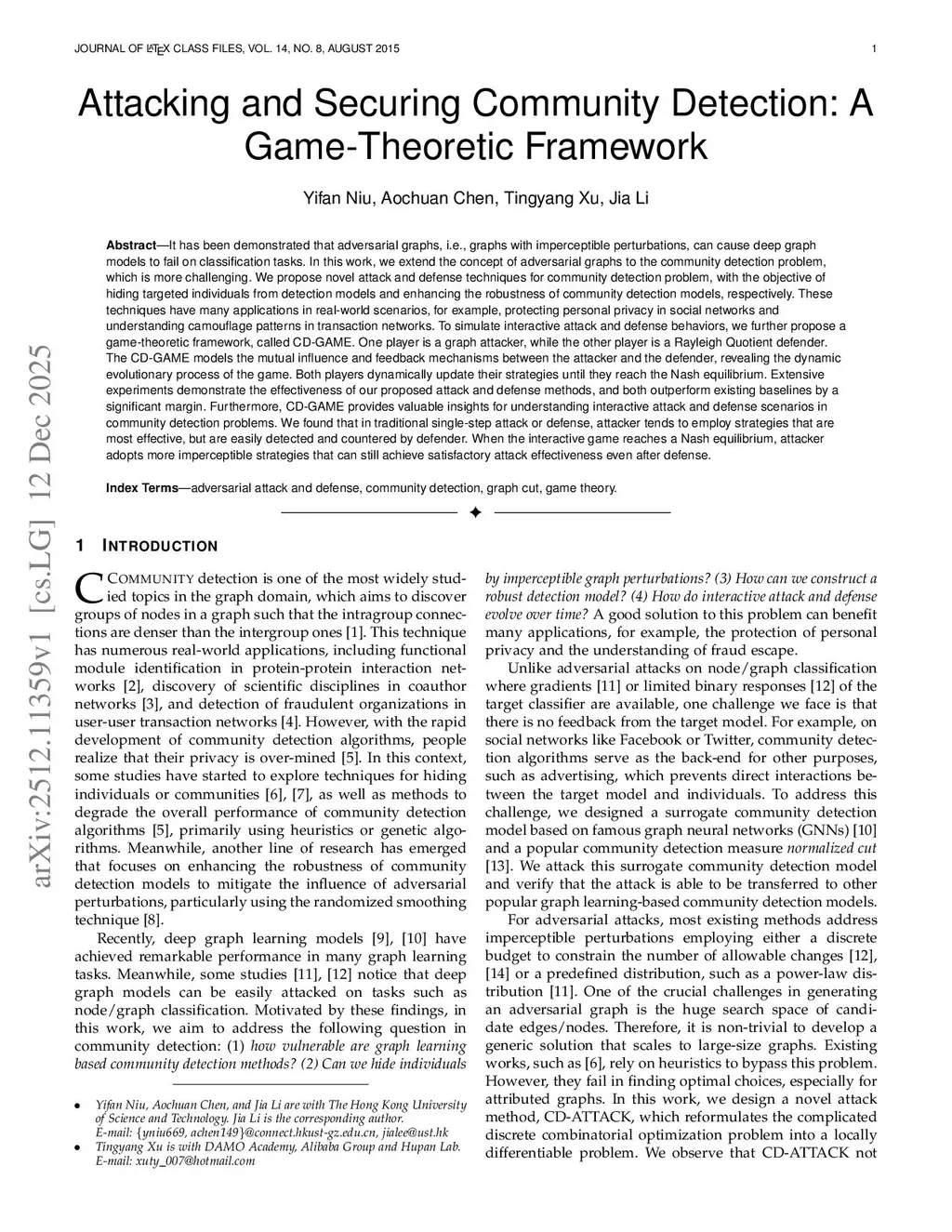 It has been demonstrated that adversarial graphs, i.e., graphs with imperceptible perturbations, can cause deep graph models to fail on classification tasks. In this work, we extend the concept of adversarial graphs to the community detection problem, which is more challenging. We propose novel attack and defense techniques for community detection problem, with the objective of hiding targeted individuals from detection models and enhancing the robustness of community detection models, respectively. These techniques have many applications in real-world scenarios, for example, protecting personal privacy in social networks and understanding camouflage patterns in transaction networks. To simulate interactive attack and defense behaviors, we further propose a game-theoretic framework, called CD-GAME. One player is a graph attacker, while the other player is a Rayleigh Quotient defender. The CD-GAME models the mutual influence and feedback mechanisms between the attacker and the defender, revealing the dynamic evolutionary process of the game. Both players dynamically update their strategies until they reach the Nash equilibrium. Extensive experiments demonstrate the effectiveness of our proposed attack and defense methods, and both outperform existing baselines by a significant margin. Furthermore, CD-GAME provides valuable insights for understanding interactive attack and defense scenarios in community detection problems. We found that in traditional single-step attack or defense, attacker tends to employ strategies that are most effective, but are easily detected and countered by defender. When the interactive game reaches a Nash equilibrium, attacker adopts more imperceptible strategies that can still achieve satisfactory attack effectiveness even after defense.