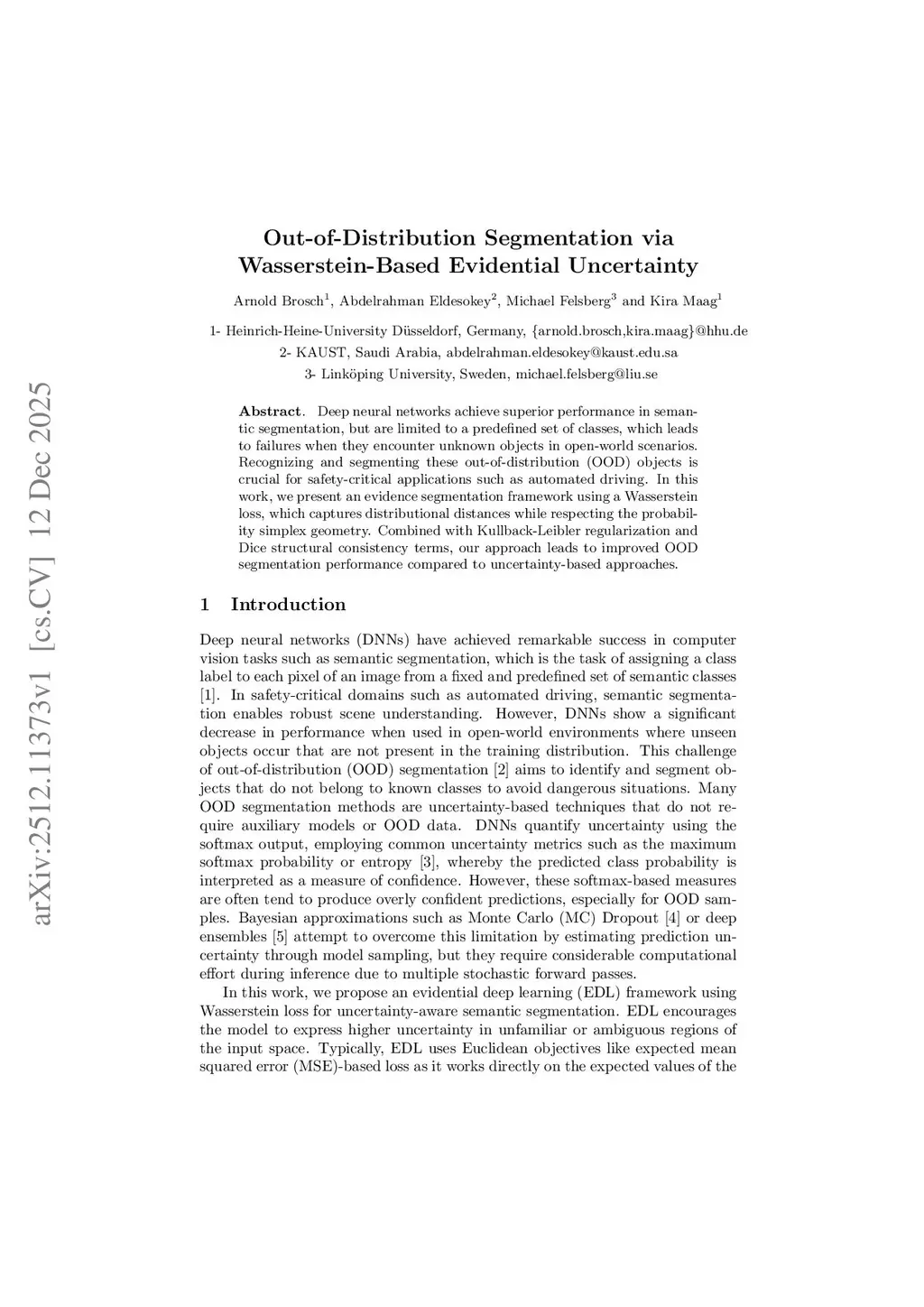 Deep neural networks achieve superior performance in semantic segmentation, but are limited to a predefined set of classes, which leads to failures when they encounter unknown objects in open-world scenarios. Recognizing and segmenting these out-of-distribution (OOD) objects is crucial for safety-critical applications such as automated driving. In this work, we present an evidence segmentation framework using a Wasserstein loss, which captures distributional distances while respecting the probability simplex geometry. Combined with Kullback-Leibler regularization and Dice structural consistency terms, our approach leads to improved OOD segmentation performance compared to uncertainty-based approaches.