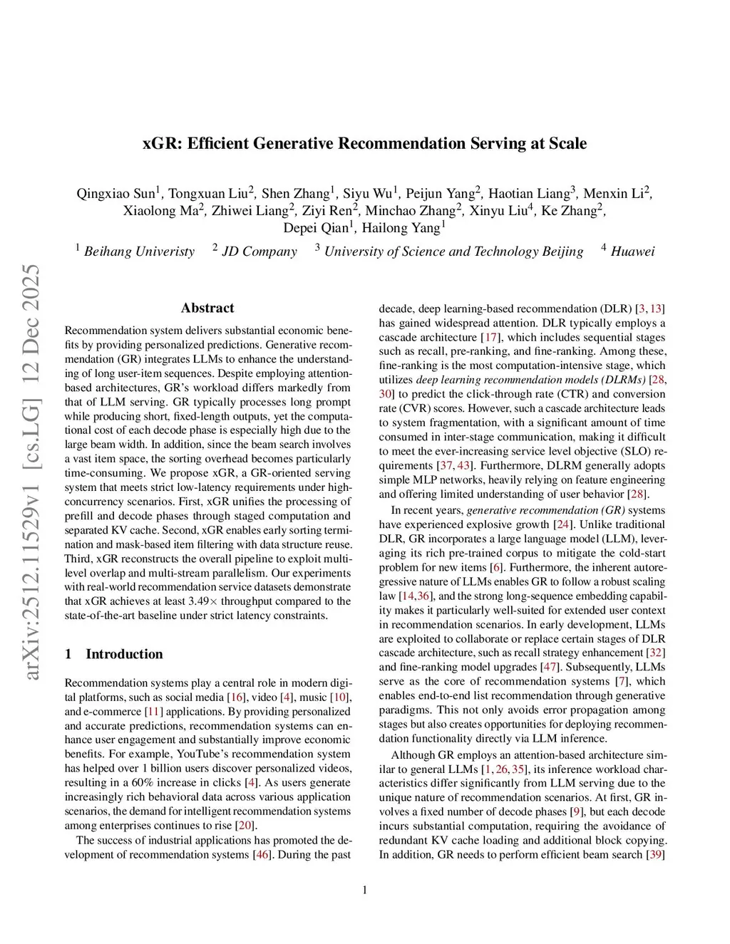Recommendation system delivers substantial economic benefits by providing personalized predictions. Generative recommendation (GR) integrates LLMs to enhance the understanding of long user-item sequences. Despite employing attention-based architectures, GR's workload differs markedly from that of LLM serving. GR typically processes long prompt while producing short, fixed-length outputs, yet the computational cost of each decode phase is especially high due to the large beam width. In addition, since the beam search involves a vast item space, the sorting overhead becomes particularly time-consuming. We propose xGR, a GR-oriented serving system that meets strict low-latency requirements under highconcurrency scenarios. First, xGR unifies the processing of prefill and decode phases through staged computation and separated KV cache. Second, xGR enables early sorting termination and mask-based item filtering with data structure reuse. Third, xGR reconstructs the overall pipeline to exploit multilevel overlap and multi-stream parallelism. Our experiments with real-world recommendation service datasets demonstrate that xGR achieves at least 3.49x throughput compared to the state-of-the-art baseline under strict latency constraints.