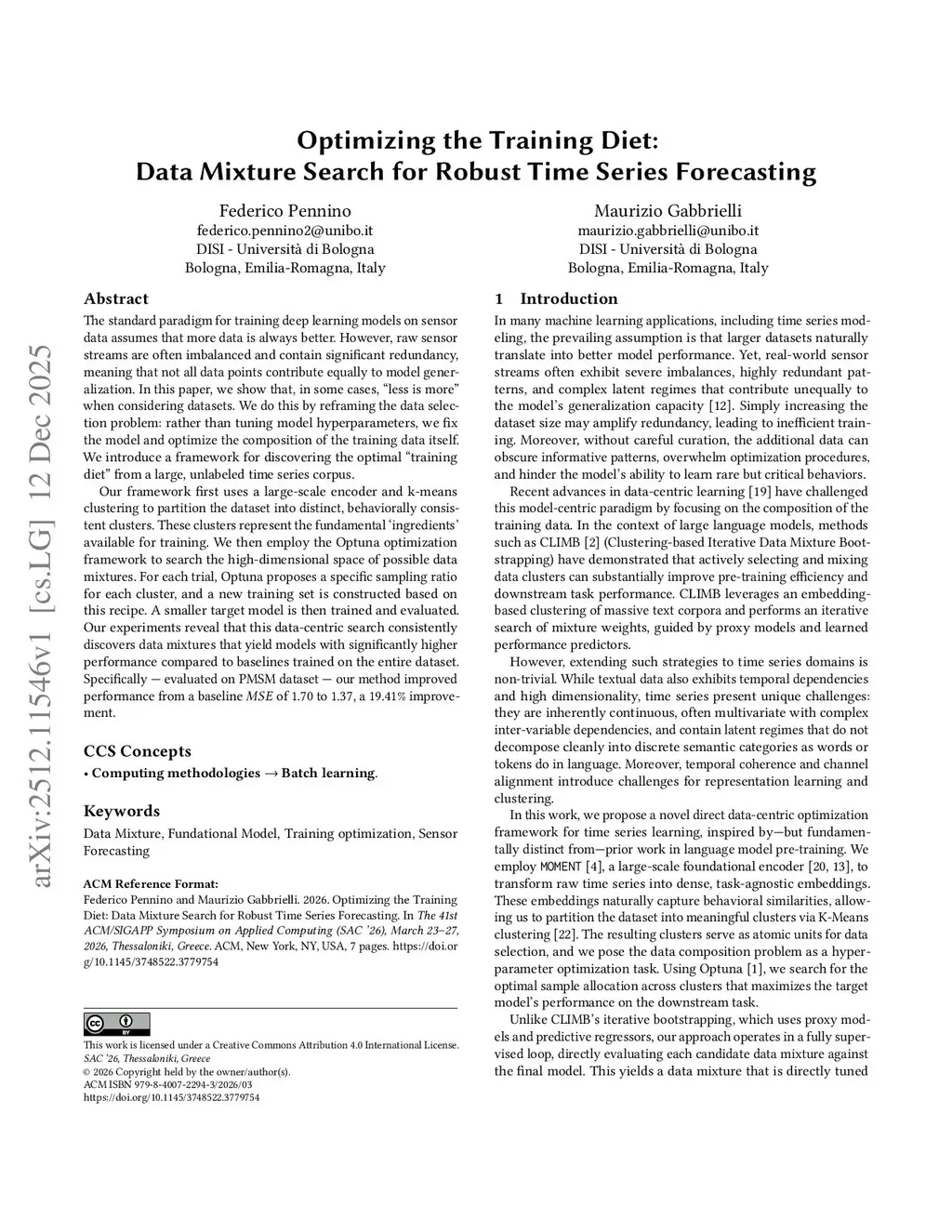 The standard paradigm for training deep learning models on sensor data assumes that more data is always better. However, raw sensor streams are often imbalanced and contain significant redundancy, meaning that not all data points contribute equally to model generalization. In this paper, we show that, in some cases, "less is more" when considering datasets. We do this by reframing the data selection problem: rather than tuning model hyperparameters, we fix the model and optimize the composition of the training data itself. We introduce a framework for discovering the optimal "training diet" from a large, unlabeled time series corpus. Our framework first uses a large-scale encoder and k-means clustering to partition the dataset into distinct, behaviorally consistent clusters. These clusters represent the fundamental íngredients' available for training. We then employ the Optuna optimization framework to search the high-dimensional space of possible data mixtures. For each trial, Optuna proposes a specific sampling ratio for each cluster, and a new training set is constructed based on this recipe. A smaller target model is then trained and evaluated. Our experiments reveal that this data-centric search consistently discovers data mixtures that yield models with significantly higher performance compared to baselines trained on the entire dataset. Specifically - evaluated on PMSM dataset - our method improved performance from a baseline MSE of 1.70 to 1.37, a 19.41% improvement.