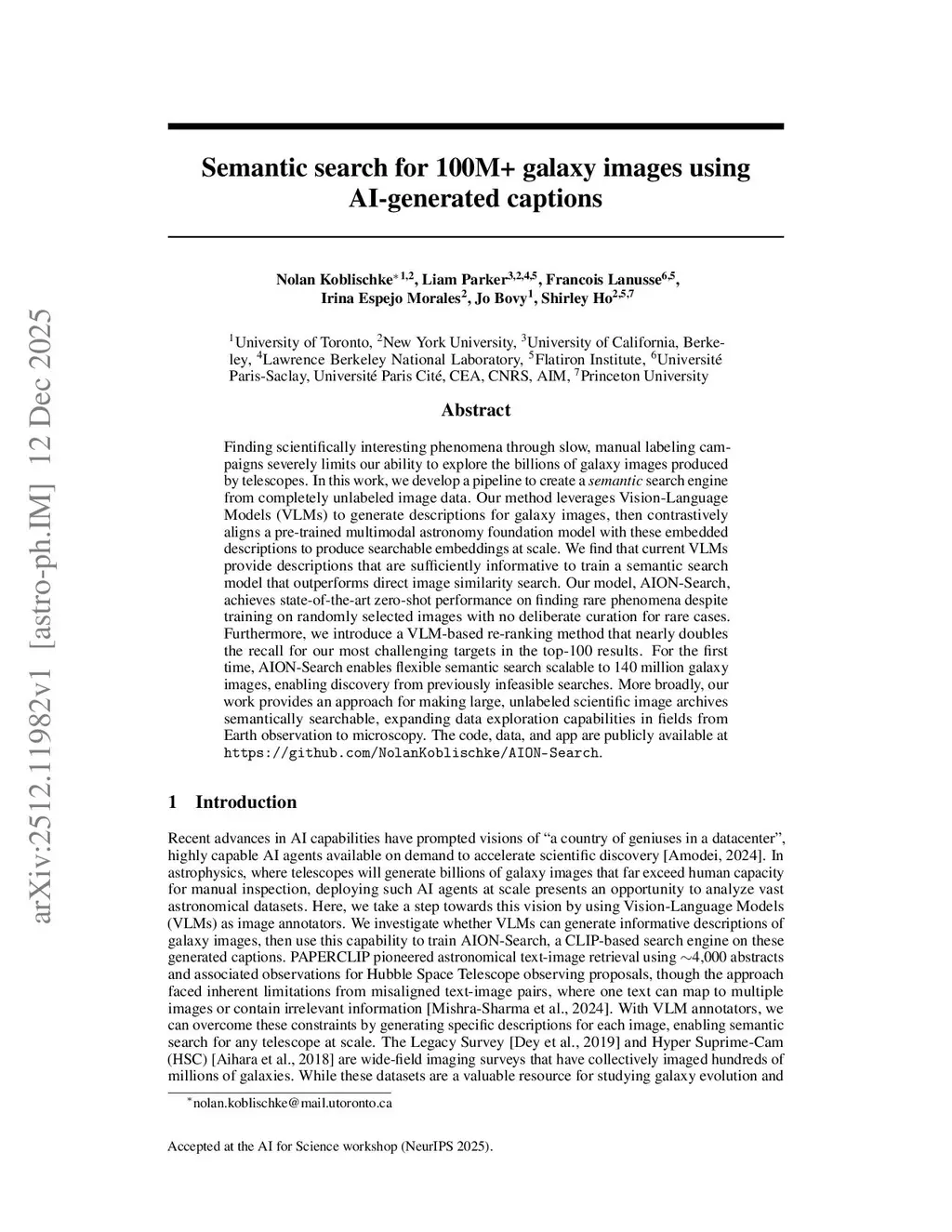 Finding scientifically interesting phenomena through slow, manual labeling campaigns severely limits our ability to explore the billions of galaxy images produced by telescopes. In this work, we develop a pipeline to create a semantic search engine from completely unlabeled image data. Our method leverages Vision-Language Models (VLMs) to generate descriptions for galaxy images, then contrastively aligns a pre-trained multimodal astronomy foundation model with these embedded descriptions to produce searchable embeddings at scale. We find that current VLMs provide descriptions that are sufficiently informative to train a semantic search model that outperforms direct image similarity search. Our model, AION-Search, achieves state-of-the-art zero-shot performance on finding rare phenomena despite training on randomly selected images with no deliberate curation for rare cases. Furthermore, we introduce a VLM-based re-ranking method that nearly doubles the recall for our most challenging targets in the top-100 results. For the first time, AION-Search enables flexible semantic search scalable to 140 million galaxy images, enabling discovery from previously infeasible searches. More broadly, our work provides an approach for making large, unlabeled scientific image archives semantically searchable, expanding data exploration capabilities in fields from Earth observation to microscopy. The code, data, and app are publicly available atthis https URL