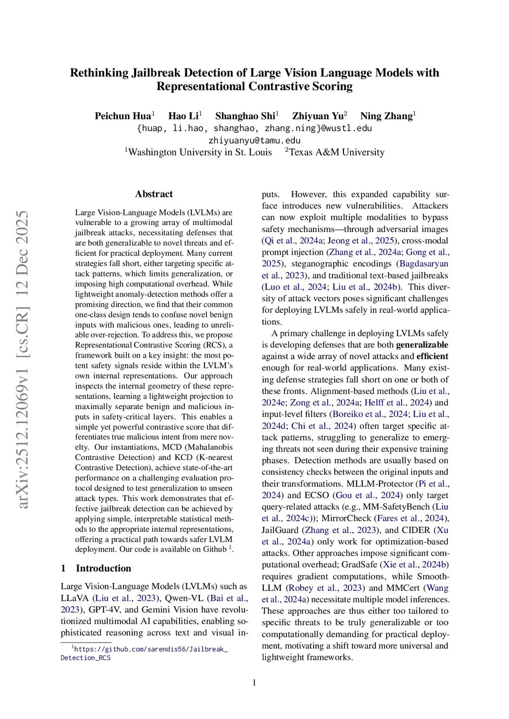 Large Vision-Language Models (LVLMs) are vulnerable to a growing array of multimodal jailbreak attacks, necessitating defenses that are both generalizable to novel threats and efficient for practical deployment. Many current strategies fall short, either targeting specific attack patterns, which limits generalization, or imposing high computational overhead. While lightweight anomaly-detection methods offer a promising direction, we find that their common one-class design tends to confuse novel benign inputs with malicious ones, leading to unreliable over-rejection. To address this, we propose Representational Contrastive Scoring (RCS), a framework built on a key insight: the most potent safety signals reside within the LVLM's own internal representations. Our approach inspects the internal geometry of these representations, learning a lightweight projection to maximally separate benign and malicious inputs in safety-critical layers. This enables a simple yet powerful contrastive score that differentiates true malicious intent from mere novelty. Our instantiations, MCD (Mahalanobis Contrastive Detection) and KCD (K-nearest Contrastive Detection), achieve state-of-the-art performance on a challenging evaluation protocol designed to test generalization to unseen attack types. This work demonstrates that effective jailbreak detection can be achieved by applying simple, interpretable statistical methods to the appropriate internal representations, offering a practical path towards safer LVLM deployment. Our code is available on Githubthis https URL.