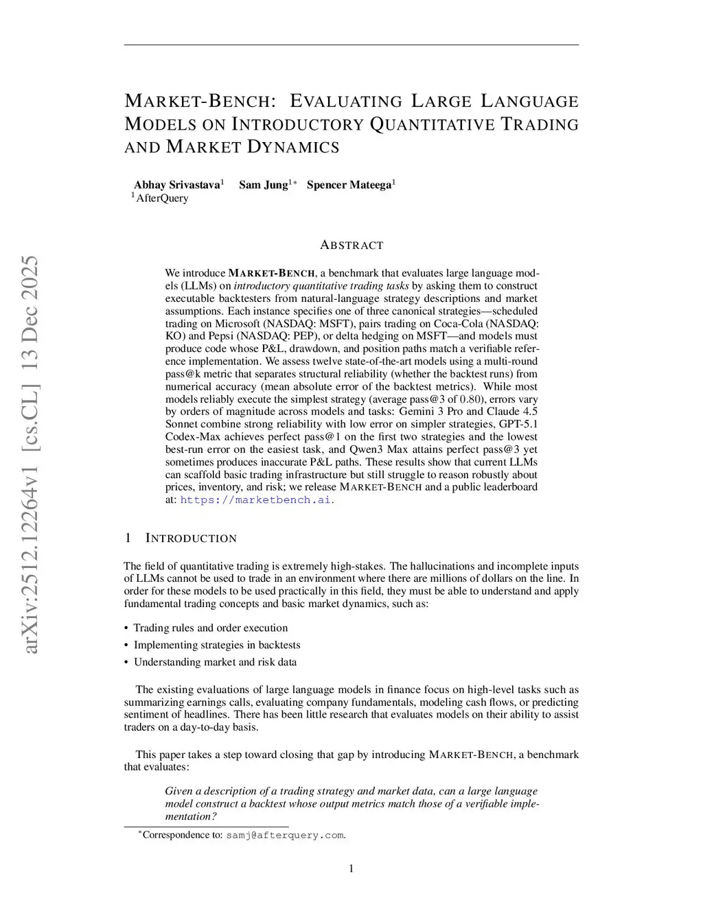 We introduce MARKET-BENCH, a benchmark that evaluates large language models (LLMs) on introductory quantitative trading tasks by asking them to construct executable backtesters from natural language strategy descriptions and market assumptions. Each instance specifies one of three canonical strategies: scheduled trading on Microsoft (NASDAQ: MSFT), pairs trading on Coca-Cola (NASDAQ: KO) and Pepsi (NASDAQ: PEP), or delta hedging on MSFT. Models must produce code whose profit and loss (P and L), drawdown, and position paths match a verifiable reference implementation. We assess thirteen state-of-the-art models using a multi-round evaluation that separates structural reliability (whether the backtest runs) from numerical accuracy (mean absolute error of the backtest metrics), assigning failed outputs a duplicated-metrics baseline MAE. While most models reliably execute the simplest strategy (average executable passes of 4.08 out of 5 rounds), errors vary by orders of magnitude across models and tasks. Gemini 3 Pro and Claude 4.5 Sonnet combine strong reliability with low error on simpler strategies. GPT-5.2 achieves strong overall performance with perfect executability. GPT-5.1 Codex-Max achieves the lowest best-run error on the easiest task. Qwen3 Max attains perfect executability yet sometimes produces inaccurate profit and loss paths. These results show that current LLMs can scaffold basic trading infrastructure but still struggle to reason robustly about prices, inventory, and risk. We release MARKET-BENCH and a public leaderboard atthis https URL.