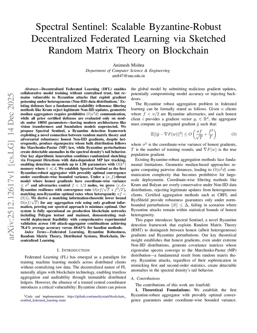 Decentralized federated learning (DFL) enables collaborative model training without centralized trust, but it remains vulnerable to Byzantine clients that poison gradients under heterogeneous (Non-IID) data. Existing defenses face a scalability trilemma: distance-based filtering (e.g., Krum) can reject legitimate Non-IID updates, geometric-median methods incur prohibitive cost, and many certified defenses are evaluated only on models below 100M parameters. We propose Spectral Sentinel, a Byzantine detection and aggregation framework that leverages a random-matrix-theoretic signature: honest Non-IID gradients produce covariance eigenspectra whose bulk follows the Marchenko-Pastur law, while Byzantine perturbations induce detectable tail anomalies. Our algorithm combines Frequent Directions sketching with data-dependent MP tracking, enabling detection on models up to 1.5B parameters using memory with . Under a threat model with coordinate-wise honest variance bounded by and adversaries, we prove -Byzantine resilience with convergence rate , and we provide a matching information-theoretic lower bound , establishing minimax optimality. We implement the full system with blockchain integration on Polygon networks and validate it across 144 attack-aggregator configurations, achieving 78.4 percent average accuracy versus 48-63 percent for baseline methods.