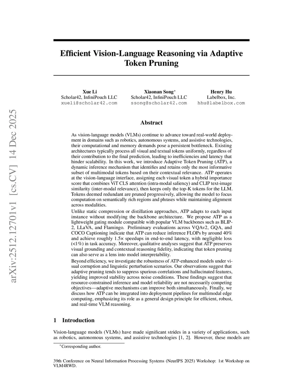 Real-world deployment of Vision-Language Models (VLMs) is hindered by high computational demands, as existing architectures inefficiently process all tokens uniformly. We introduce Adaptive Token Pruning (ATP), a dynamic inference mechanism that retains only the most informative tokens based on contextual relevance. ATP operates at the vision-language interface, assigning a hybrid importance score combining ViT CLS attention (intra-modal saliency) and CLIP text-image similarity (inter-modal relevance) to keep top-K tokens for the LLM. Unlike static compression, ATP adapts to each input without modifying the backbone. Proposed as a lightweight gating module, ATP is compatible with popular backbones like BLIP-2, LLaVA, and Flamingo. Preliminary evaluations across VQAv2, GQA, and COCO indicate that ATP reduces inference FLOPs by around 40% and achieves roughly 1.5x speedups in end-to-end latency with negligible accuracy loss (less than 1%). Qualitative analyses suggest ATP preserves visual grounding and enhances interpretability. Beyond efficiency, we investigate robustness under corruptions; observations suggest adaptive pruning suppresses spurious correlations, improving stability. These findings imply that resource-constrained inference and model reliability are not competing objectives. Finally, we discuss ATP's role in efficient multimodal edge computing pipelines.