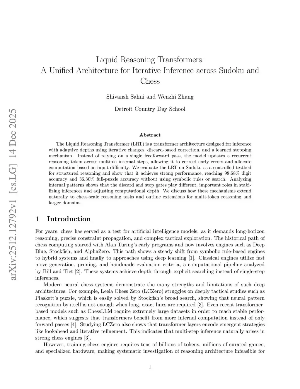 The Liquid Reasoning Transformer (LRT) is a transformer architecture designed for inference with adaptive depths using iterative changes, discard-based correction, and a learned stopping mechanism. Instead of relying on a single feedforward pass, the model updates a recurrent reasoning token across multiple internal steps, allowing it to correct early errors and allocate computation based on input difficulty. We evaluate the LRT on Sudoku as a controlled testbed for structured reasoning and show that it achieves strong performance, reaching 98.68% digit accuracy and 36.30% full-puzzle accuracy without using symbolic rules or search. Analyzing internal patterns shows that the discard and stop gates play different, important roles in stabilizing inferences and adjusting computational depth. We discuss how these mechanisms extend naturally to chess-scale reasoning tasks and outline extensions for multi-token reasoning and larger domains.