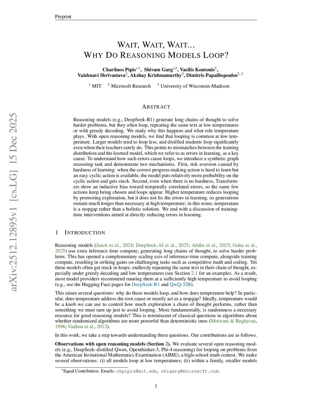 Reasoning models (e.g., DeepSeek-R1) generate long chains of thought to solve harder problems, but they often loop, repeating the same text at low temperatures or with greedy decoding. We study why this happens and what role temperature plays. With open reasoning models, we find that looping is common at low temperature. Larger models tend to loop less, and distilled students loop significantly even when their teachers rarely do. This points to mismatches between the training distribution and the learned model, which we refer to as errors in learning, as a key cause. To understand how such errors cause loops, we introduce a synthetic graph reasoning task and demonstrate two mechanisms. First, risk aversion caused by hardness of learning: when the correct progress-making action is hard to learn but an easy cyclic action is available, the model puts relatively more probability on the cyclic action and gets stuck. Second, even when there is no hardness, Transformers show an inductive bias toward temporally correlated errors, so the same few actions keep being chosen and loops appear. Higher temperature reduces looping by promoting exploration, but it does not fix the errors in learning, so generations remain much longer than necessary at high temperature; in this sense, temperature is a stopgap rather than a holistic solution. We end with a discussion of training-time interventions aimed at directly reducing errors in learning.