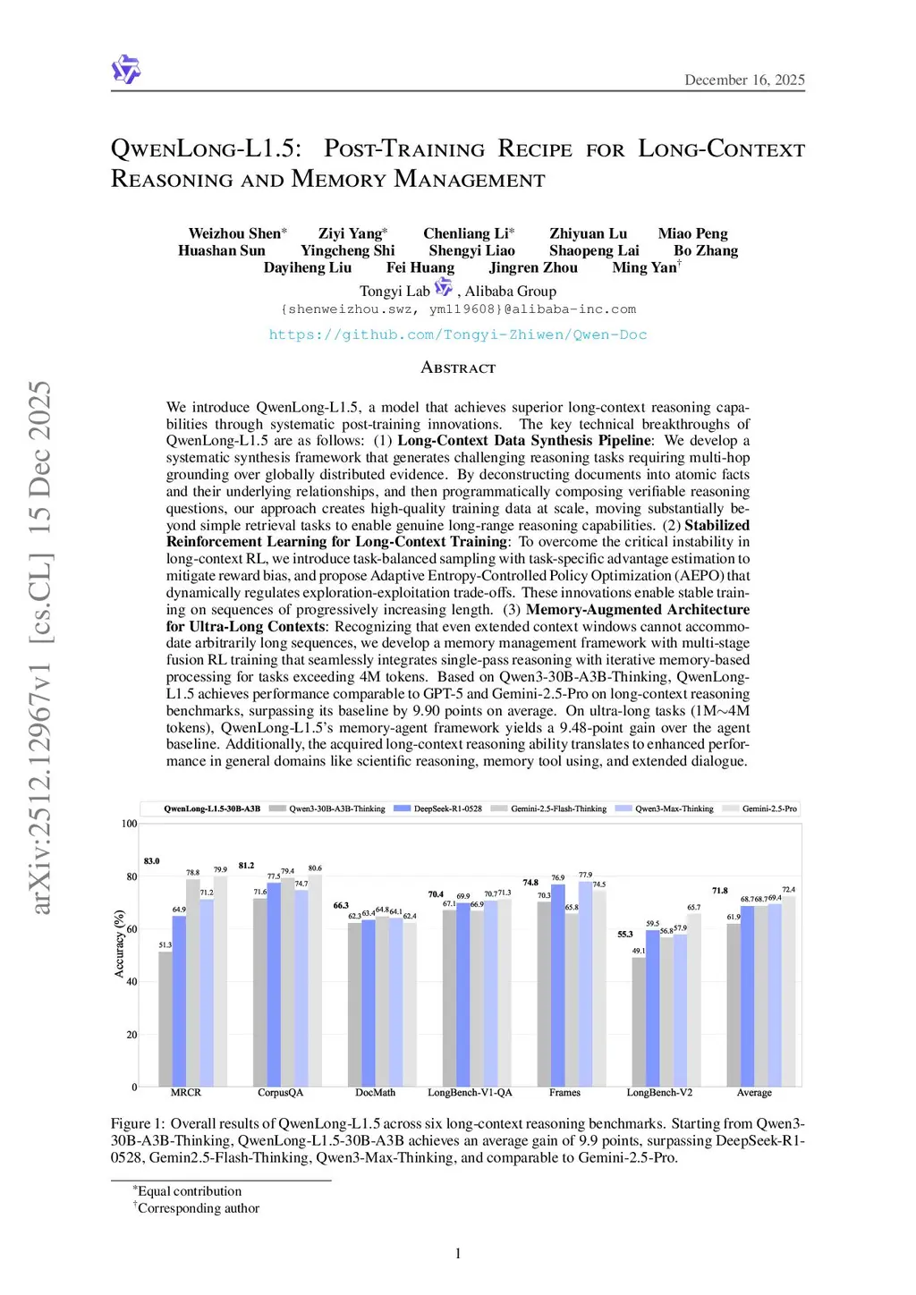 QwenLong-L1.5: Post-Training Recipe for Long-Context Reasoning and Memory Management