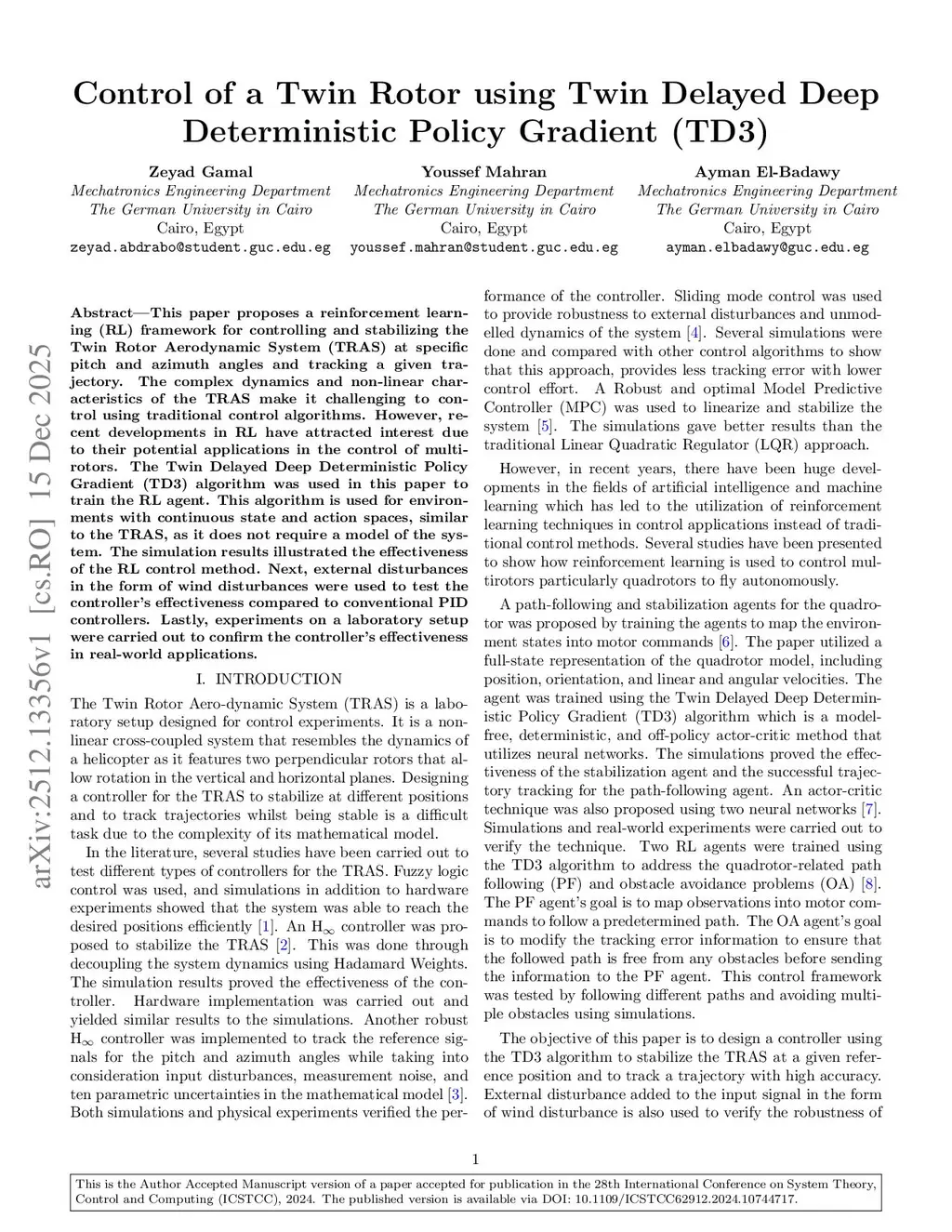 Control of a Twin Rotor using Twin Delayed Deep Deterministic Policy Gradient (TD3)