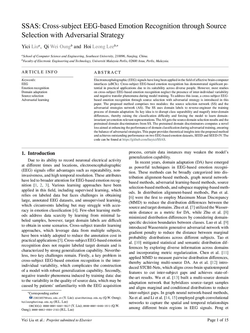 SSAS: Cross-subject EEG-based Emotion Recognition through Source Selection with Adversarial Strategy