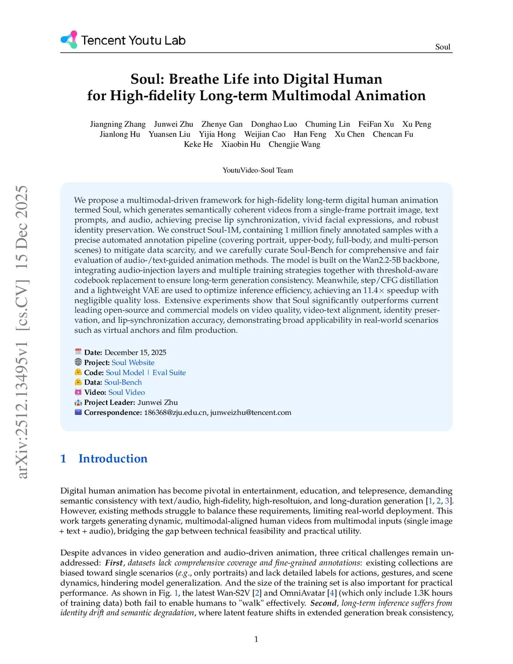 We propose a multimodal-driven framework for high-fidelity long-term digital human animation termed , which generates semantically coherent videos from a single-frame portrait image, text prompts, and audio, achieving precise lip synchronization, vivid facial expressions, and robust identity preservation. We construct Soul-1M, containing 1 million finely annotated samples with a precise automated annotation pipeline (covering portrait, upper-body, full-body, and multi-person scenes) to mitigate data scarcity, and we carefully curate Soul-Bench for comprehensive and fair evaluation of audio-/text-guided animation methods. The model is built on the Wan2.2-5B backbone, integrating audio-injection layers and multiple training strategies together with threshold-aware codebook replacement to ensure long-term generation consistency. Meanwhile, step/CFG distillation and a lightweight VAE are used to optimize inference efficiency, achieving an 11.4 speedup with negligible quality loss. Extensive experiments show that Soul significantly outperforms current leading open-source and commercial models on video quality, video-text alignment, identity preservation, and lip-synchronization accuracy, demonstrating broad applicability in real-world scenarios such as virtual anchors and film production. Project page atthis https URL
