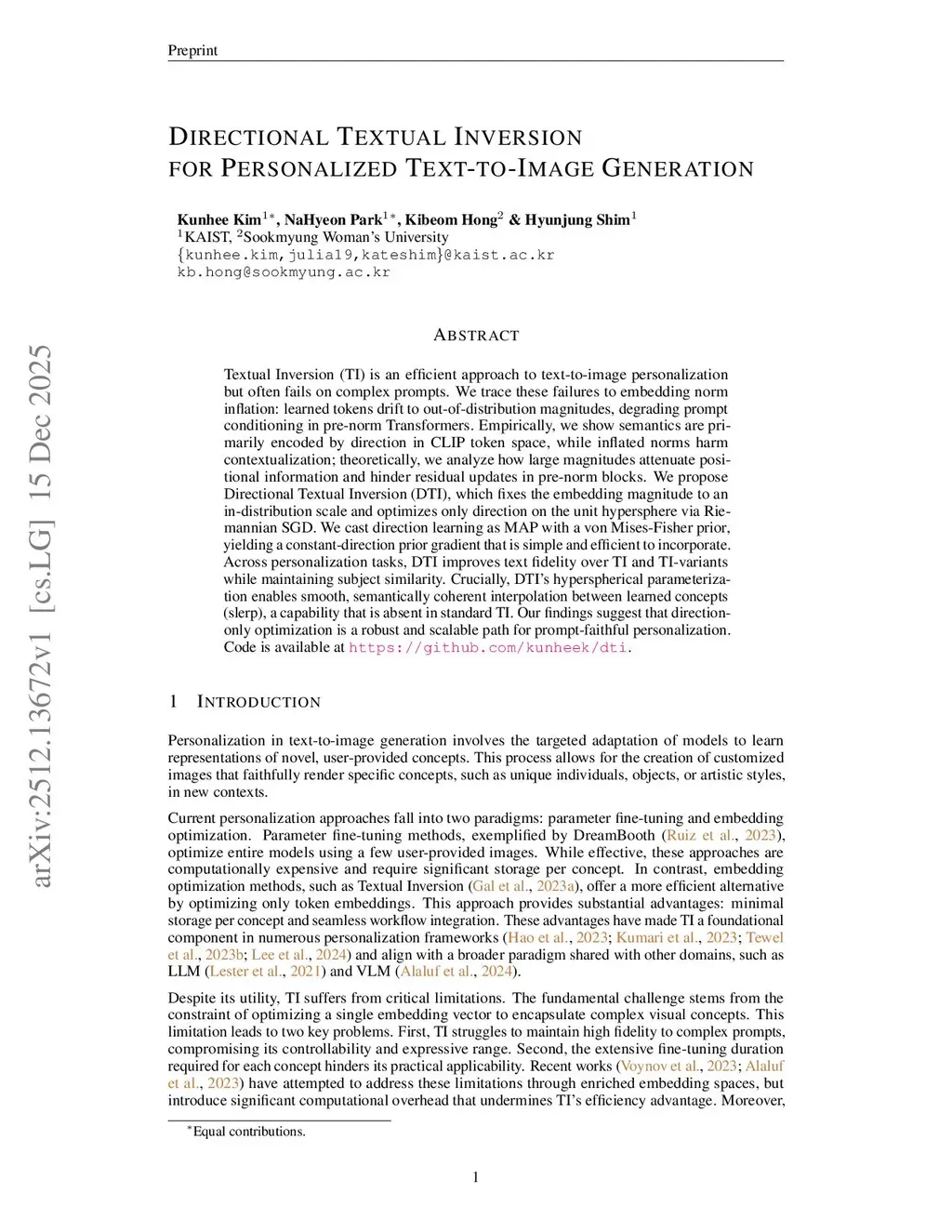 Textual Inversion (TI) is an efficient approach to text-to-image personalization but often fails on complex prompts. We trace these failures to embedding norm inflation: learned tokens drift to out-of-distribution magnitudes, degrading prompt conditioning in pre-norm Transformers. Empirically, we show semantics are primarily encoded by direction in CLIP token space, while inflated norms harm contextualization; theoretically, we analyze how large magnitudes attenuate positional information and hinder residual updates in pre-norm blocks. We propose Directional Textual Inversion (DTI), which fixes the embedding magnitude to an in-distribution scale and optimizes only direction on the unit hypersphere via Riemannian SGD. We cast direction learning as MAP with a von Mises-Fisher prior, yielding a constant-direction prior gradient that is simple and efficient to incorporate. Across personalization tasks, DTI improves text fidelity over TI and TI-variants while maintaining subject similarity. Crucially, DTI's hyperspherical parameterization enables smooth, semantically coherent interpolation between learned concepts (slerp), a capability that is absent in standard TI. Our findings suggest that direction-only optimization is a robust and scalable path for prompt-faithful personalization.