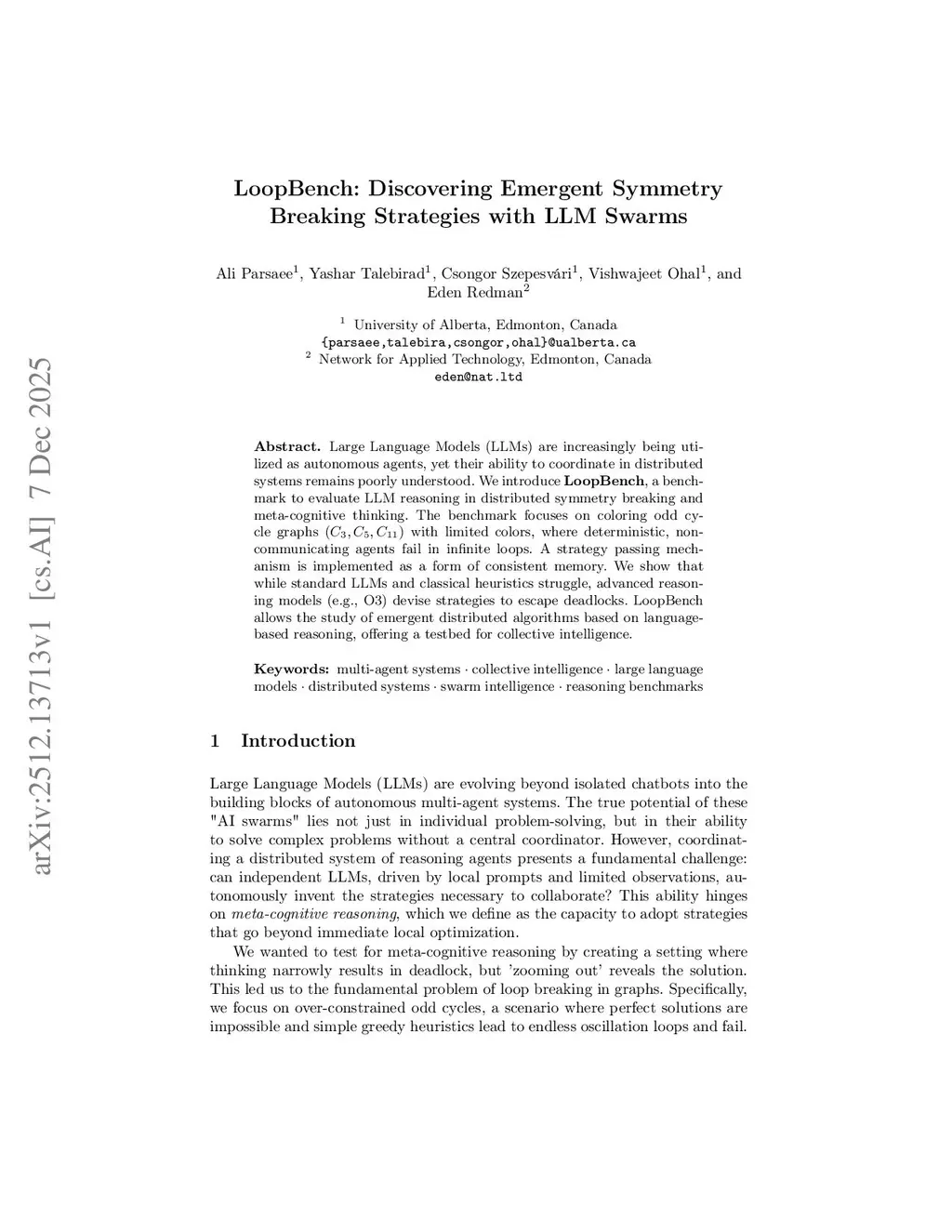 Large Language Models (LLMs) are increasingly being utilized as autonomous agents, yet their ability to coordinate in distributed systems remains poorly understood. We introduce \textbf{LoopBench}, a benchmark to evaluate LLM reasoning in distributed symmetry breaking and meta-cognitive thinking. The benchmark focuses on coloring odd cycle graphs () with limited colors, where deterministic, non-communicating agents fail in infinite loops. A strategy passing mechanism is implemented as a form of consistent memory. We show that while standard LLMs and classical heuristics struggle, advanced reasoning models (e.g., O3) devise strategies to escape deadlocks. LoopBench allows the study of emergent distributed algorithms based on language-based reasoning, offering a testbed for collective intelligence.