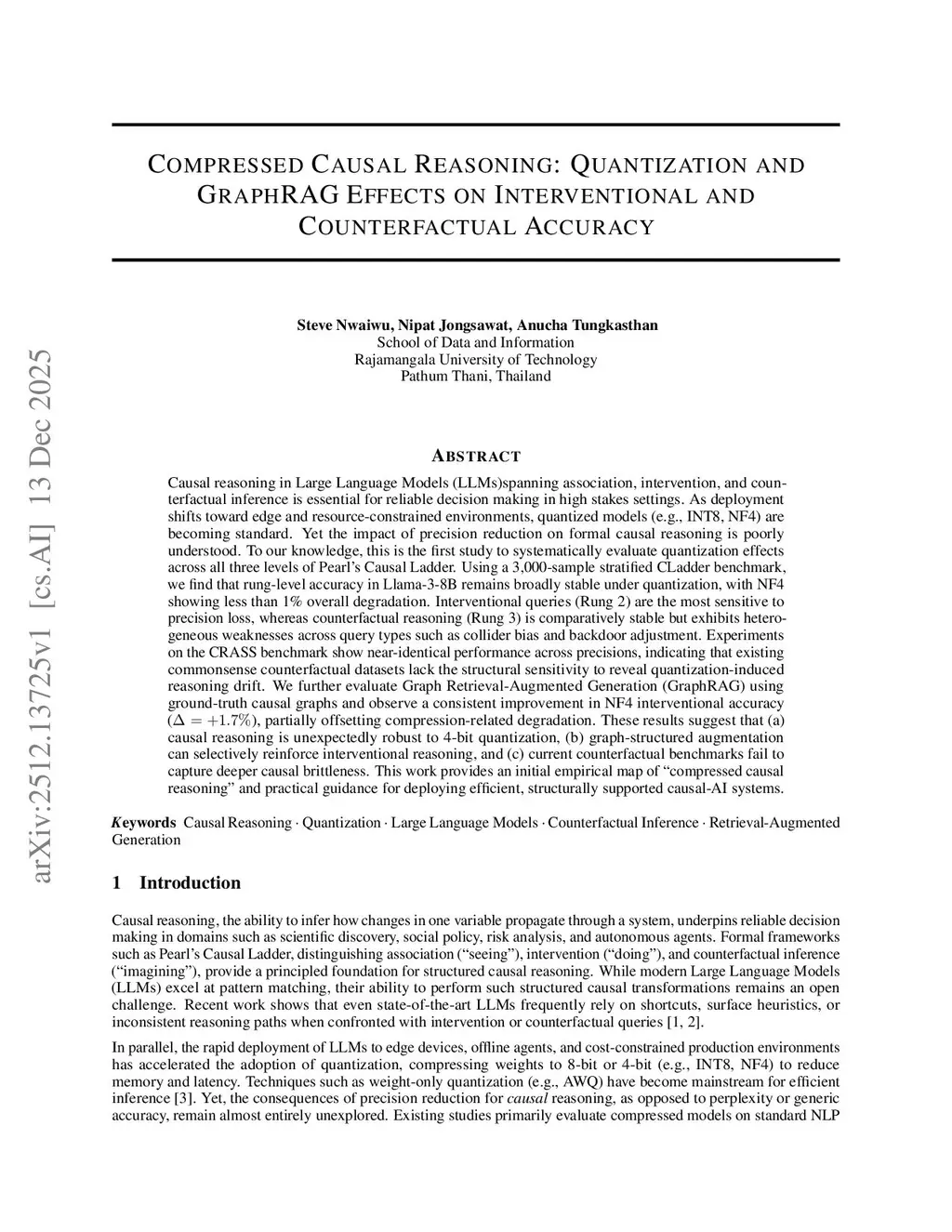Causal reasoning in Large Language Models spanning association, intervention, and counterfactual inference is essential for reliable decision making in high stakes settings. As deployment shifts toward edge and resource constrained environments, quantized models such as INT8 and NF4 are becoming standard. Yet the impact of precision reduction on formal causal reasoning is poorly understood. To our knowledge, this is the first study to systematically evaluate quantization effects across all three levels of Pearls Causal Ladder. Using a 3000 sample stratified CLadder benchmark, we find that rung level accuracy in Llama 3 8B remains broadly stable under quantization, with NF4 showing less than one percent overall degradation. Interventional queries at rung 2 are the most sensitive to precision loss, whereas counterfactual reasoning at rung 3 is comparatively stable but exhibits heterogeneous weaknesses across query types such as collider bias and backdoor adjustment. Experiments on the CRASS benchmark show near identical performance across precisions, indicating that existing commonsense counterfactual datasets lack the structural sensitivity needed to reveal quantization induced reasoning drift. We further evaluate Graph Retrieval Augmented Generation using ground truth causal graphs and observe a consistent improvement in NF4 interventional accuracy of plus 1.7 percent, partially offsetting compression related degradation. These results suggest that causal reasoning is unexpectedly robust to four bit quantization, graph structured augmentation can selectively reinforce interventional reasoning, and current counterfactual benchmarks fail to capture deeper causal brittleness. This work provides an initial empirical map of compressed causal reasoning and practical guidance for deploying efficient and structurally supported causal AI systems.
