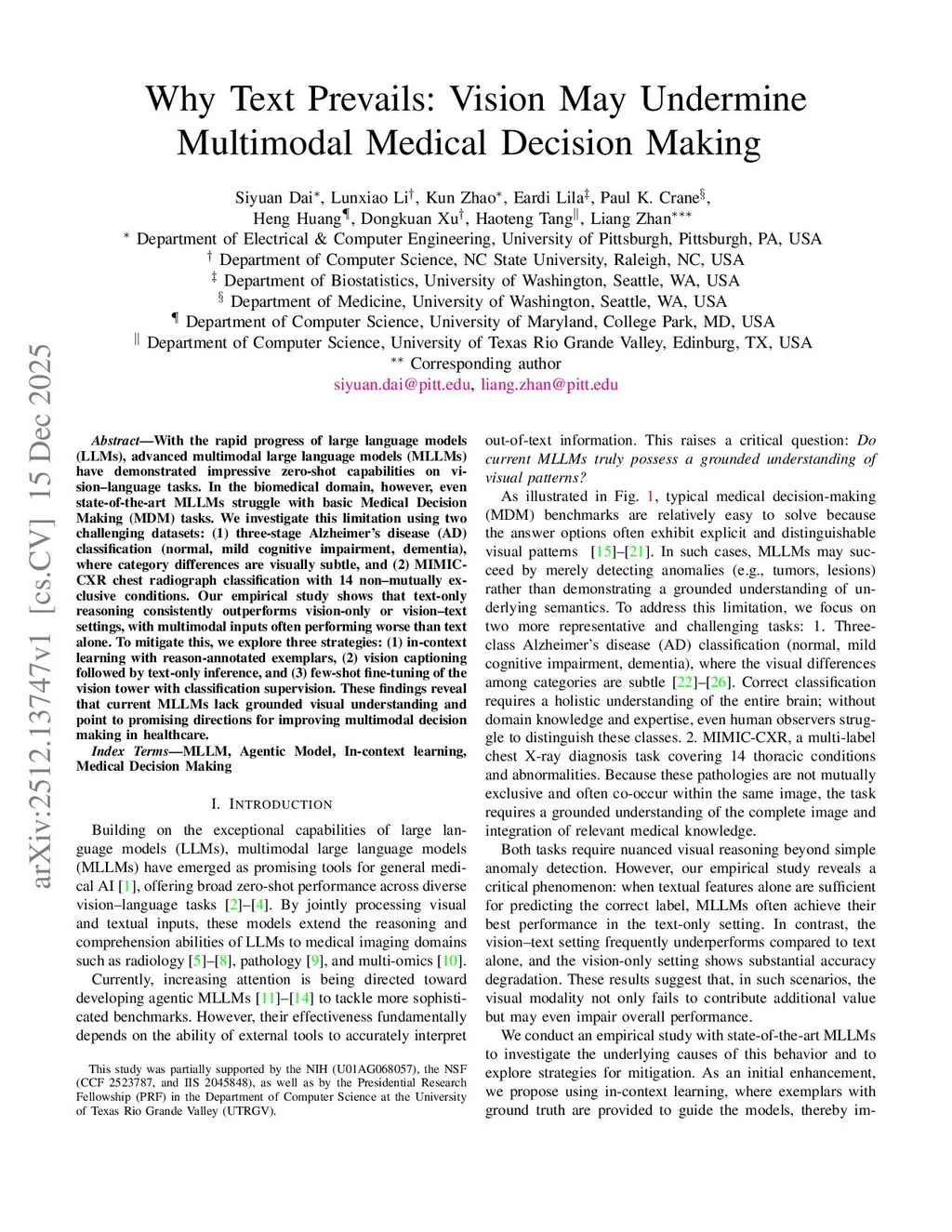 With the rapid progress of large language models (LLMs), advanced multimodal large language models (MLLMs) have demonstrated impressive zero-shot capabilities on vision-language tasks. In the biomedical domain, however, even state-of-the-art MLLMs struggle with basic Medical Decision Making (MDM) tasks. We investigate this limitation using two challenging datasets: (1) three-stage Alzheimer's disease (AD) classification (normal, mild cognitive impairment, dementia), where category differences are visually subtle, and (2) MIMIC-CXR chest radiograph classification with 14 non-mutually exclusive conditions. Our empirical study shows that text-only reasoning consistently outperforms vision-only or vision-text settings, with multimodal inputs often performing worse than text alone. To mitigate this, we explore three strategies: (1) in-context learning with reason-annotated exemplars, (2) vision captioning followed by text-only inference, and (3) few-shot fine-tuning of the vision tower with classification supervision. These findings reveal that current MLLMs lack grounded visual understanding and point to promising directions for improving multimodal decision making in healthcare.