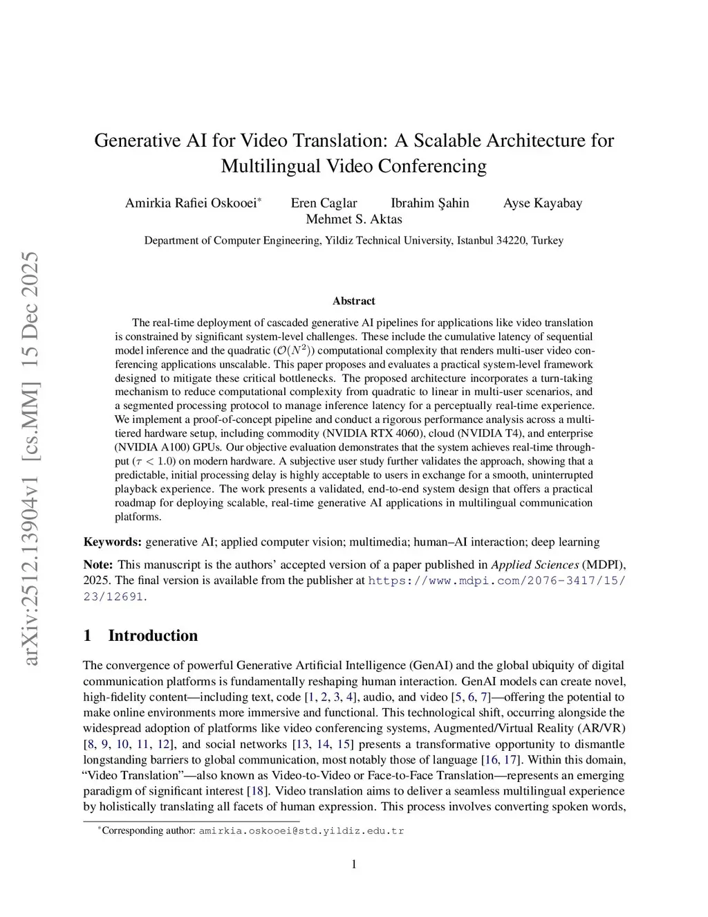 The real-time deployment of cascaded generative AI pipelines for applications like video translation is constrained by significant system-level challenges. These include the cumulative latency of sequential model inference and the quadratic () computational complexity that renders multi-user video conferencing applications unscalable. This paper proposes and evaluates a practical system-level framework designed to mitigate these critical bottlenecks. The proposed architecture incorporates a turn-taking mechanism to reduce computational complexity from quadratic to linear in multi-user scenarios, and a segmented processing protocol to manage inference latency for a perceptually real-time experience. We implement a proof-of-concept pipeline and conduct a rigorous performance analysis across a multi-tiered hardware setup, including commodity (NVIDIA RTX 4060), cloud (NVIDIA T4), and enterprise (NVIDIA A100) GPUs. Our objective evaluation demonstrates that the system achieves real-time throughput () on modern hardware. A subjective user study further validates the approach, showing that a predictable, initial processing delay is highly acceptable to users in exchange for a smooth, uninterrupted playback experience. The work presents a validated, end-to-end system design that offers a practical roadmap for deploying scalable, real-time generative AI applications in multilingual communication platforms.