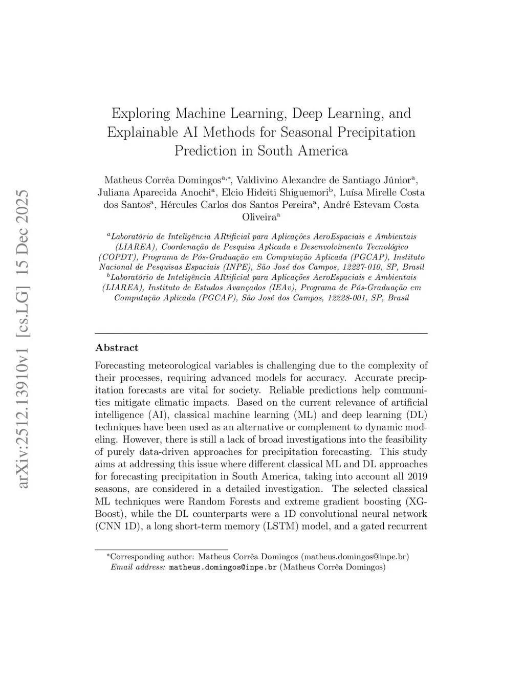 Forecasting meteorological variables is challenging due to the complexity of their processes, requiring advanced models for accuracy. Accurate precipitation forecasts are vital for society. Reliable predictions help communities mitigate climatic impacts. Based on the current relevance of artificial intelligence (AI), classical machine learning (ML) and deep learning (DL) techniques have been used as an alternative or complement to dynamic modeling. However, there is still a lack of broad investigations into the feasibility of purely data-driven approaches for precipitation forecasting. This study aims at addressing this issue where different classical ML and DL approaches for forecasting precipitation in South America, taking into account all 2019 seasons, are considered in a detailed investigation. The selected classical ML techniques were Random Forests and extreme gradient boosting (XGBoost), while the DL counterparts were a 1D convolutional neural network (CNN 1D), a long short-term memory (LSTM) model, and a gated recurrent unit (GRU) model. Additionally, the Brazilian Global Atmospheric Model (BAM) was used as a representative of the traditional dynamic modeling approach. We also relied on explainable artificial intelligence (XAI) to provide some explanations for the models behaviors. LSTM showed strong predictive performance while BAM, the traditional dynamic model representative, had the worst results. Despite presented the higher latency, LSTM was most accurate for heavy precipitation. If cost is a concern, XGBoost offers lower latency with slightly accuracy loss. The results of this research confirm the viability of DL models for climate forecasting, solidifying a global trend in major meteorological and climate forecasting centers.