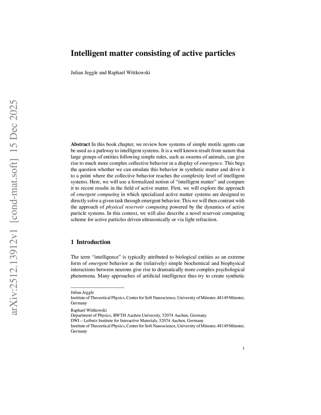 In this book chapter, we review how systems of simple motile agents can be used as a pathway to intelligent systems. It is a well known result from nature that large groups of entities following simple rules, such as swarms of animals, can give rise to much more complex collective behavior in a display of emergence. This begs the question whether we can emulate this behavior in synthetic matter and drive it to a point where the collective behavior reaches the complexity level of intelligent systems. Here, we will use a formalized notion of "intelligent matter" and compare it to recent results in the field of active matter. First, we will explore the approach of emergent computing in which specialized active matter systems are designed to directly solve a given task through emergent behavior. This we will then contrast with the approach of physical reservoir computing powered by the dynamics of active particle systems. In this context, we will also describe a novel reservoir computing scheme for active particles driven ultrasonically or via light refraction.
